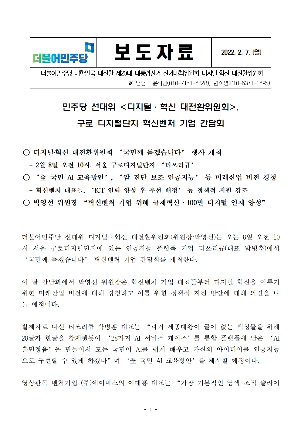 [보도자료] 더불어민주당 선대위 디지털·혁신대전환위원회, 구로 디지털단지 혁신벤처 기업 간담회 개최