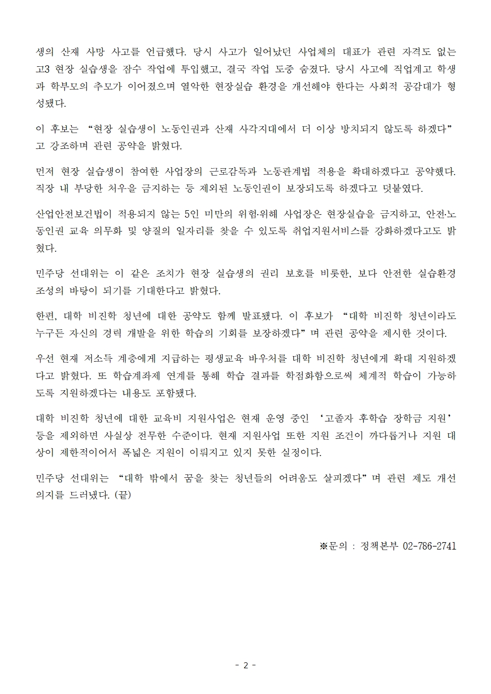 [보도자료] 더불어민주당 선대위 정책본부, '이재명은 합니다. 소확행 공약 시리즈 66' 직업계고 학생 안전 대책 및 대학 비진학 청년 지원 공약 발표