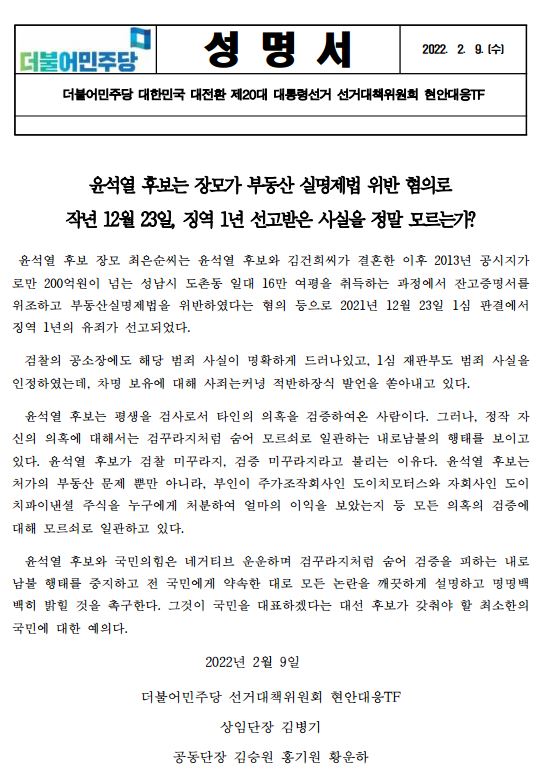 [성명서] 현안대응TF 단장단 성명서, 윤석열 후보는 장모가 부동산 실명제법 위반으로 징역 1년 선고 받은 사실을 정말 모르는가
