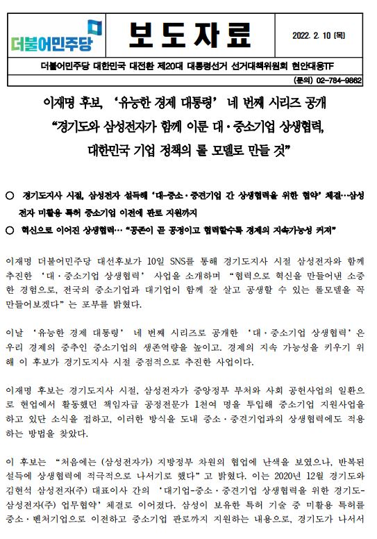 [보도자료] 더불어민주당 선대위 현안대응TF, 이재명 후보 '유능한 경제대통령' 네 번째 시리즈, '경기도-삼성전자 상생협력' 성과 공개
