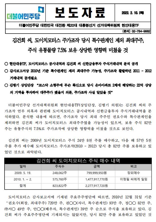 (수정) [보도자료] 더불어민주당 선대위 현안대응TF, 김건희 씨, 도이치모터스 주가조작 당시 특수관계인 제외 최대주주, 주식 유통물량 7.5% 보유 상당한 영향력 미쳤을 것