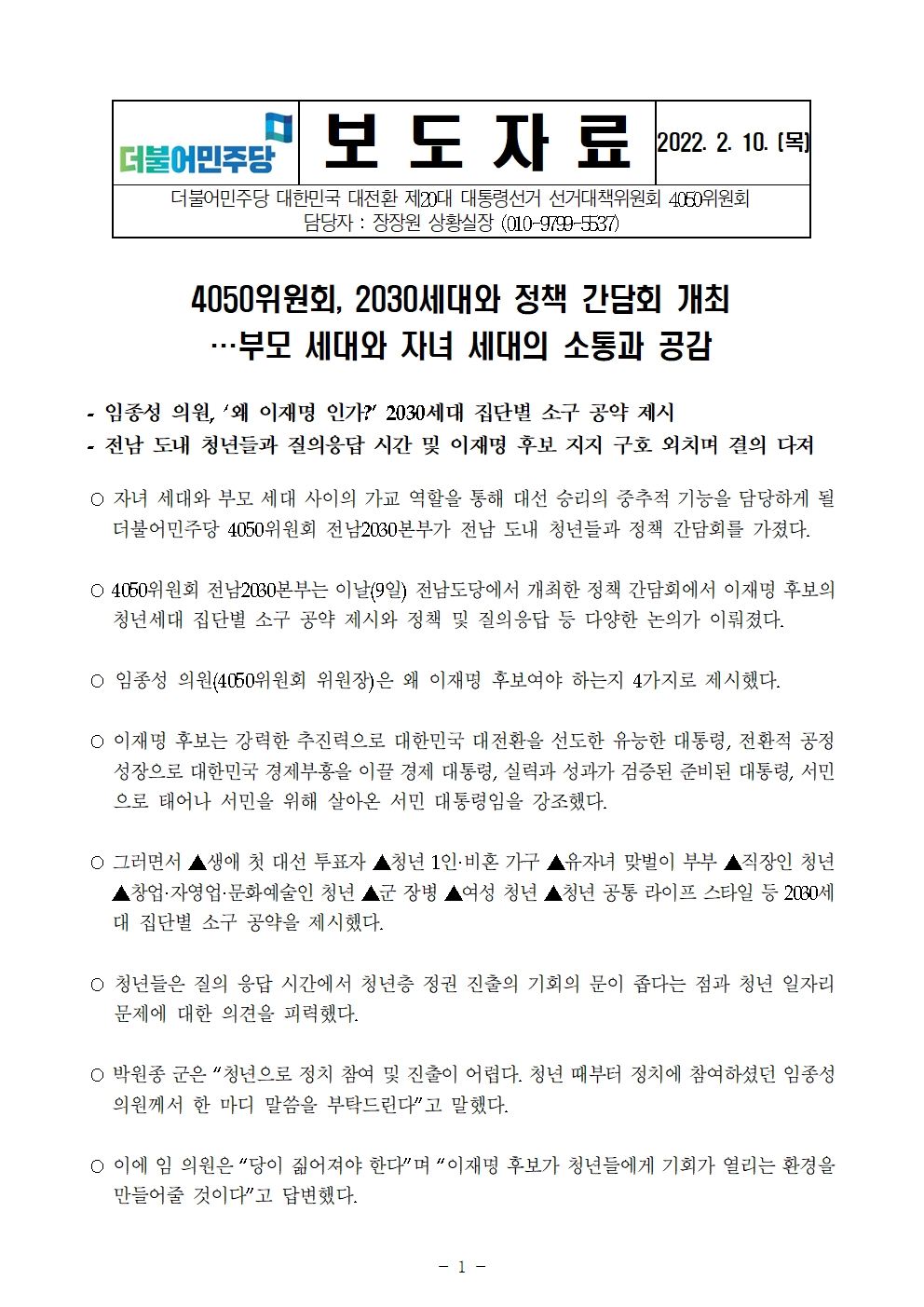 [보도자료] 더불어민주당 선대위 4050위원회, 2030세대와 정책 간담회 개최