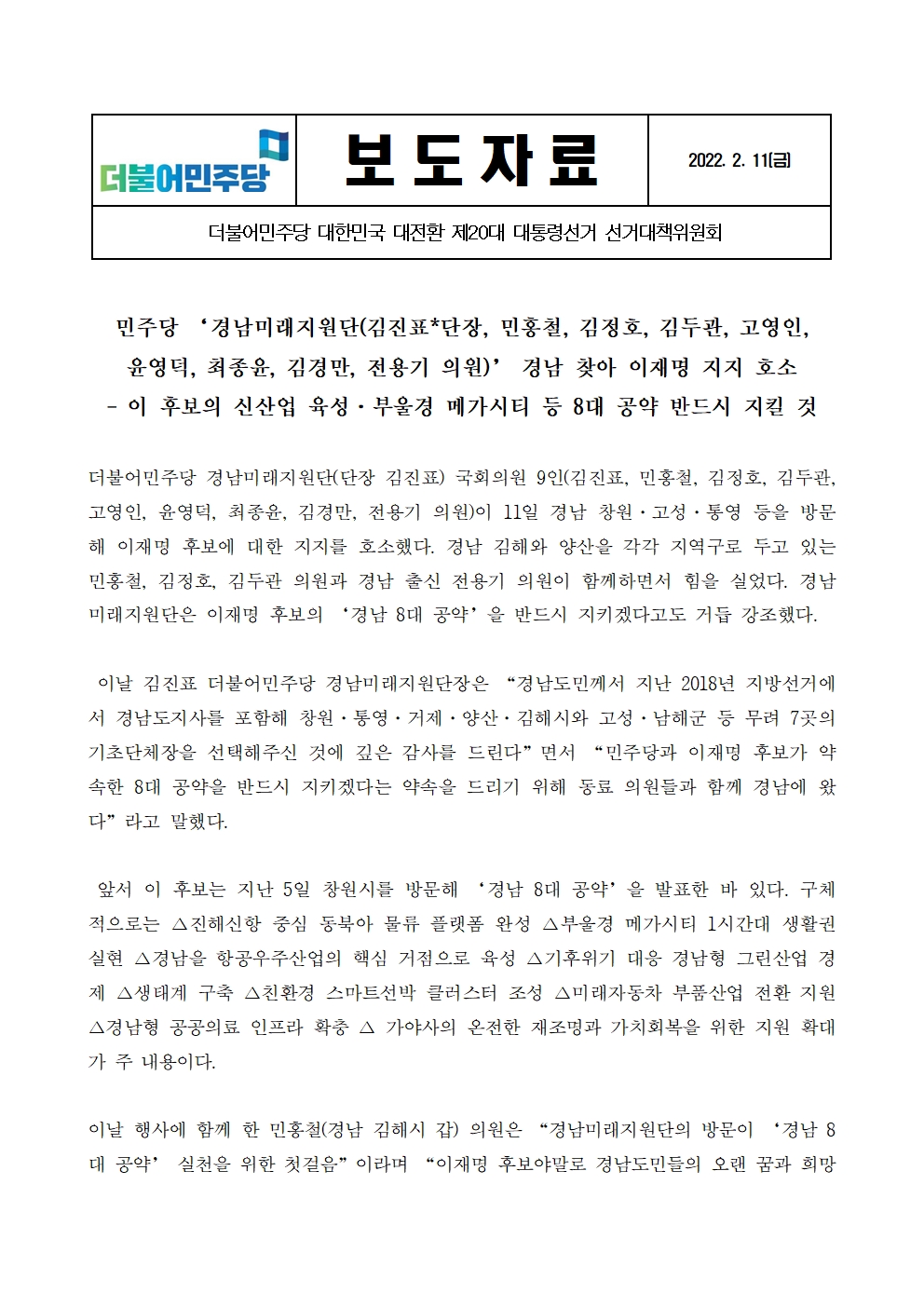 [보도자료] 더불어민주당 선대위 경남미래지원단, 경남 찾아 이재명 지지 호소