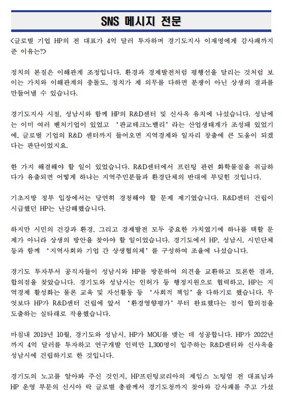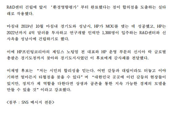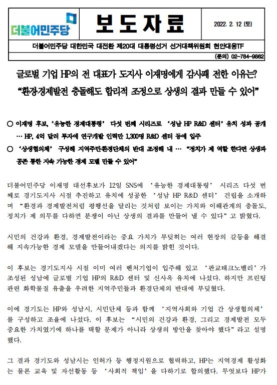 [보도자료] 더불어민주당 선대위 현안대응TF, 이재명 후보 '유능한 경제대통령' 다섯 번째 시리즈, '성남 HP R&D 센터' 유치 성과' 공개