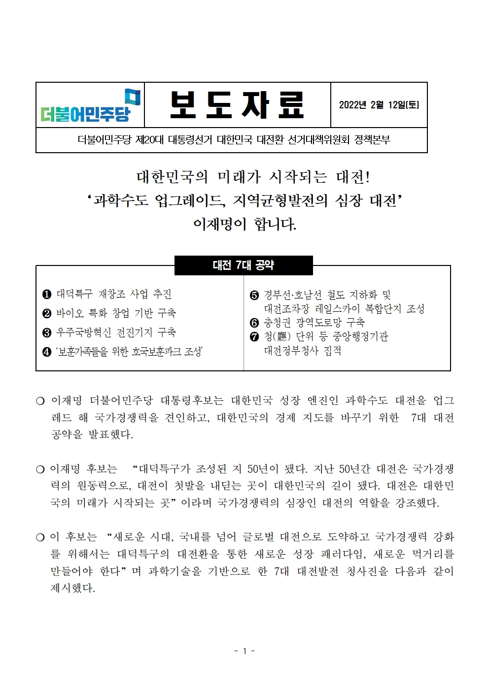 [보도자료] 더불어민주당 선대위 정책본부, 대전 7대 공약 발표
