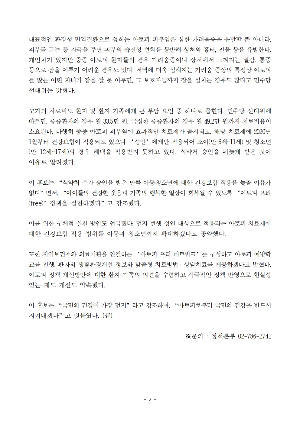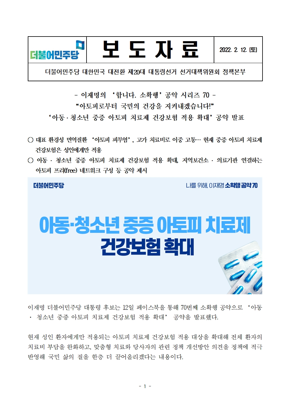 [보도자료] 더불어민주당 선대위 정책본부, '이재명은 합니다. 소확행 공약 시리즈 70' 아동·청소년 중증 아토피 치료제 건강보험 적용 확대 공약 발표