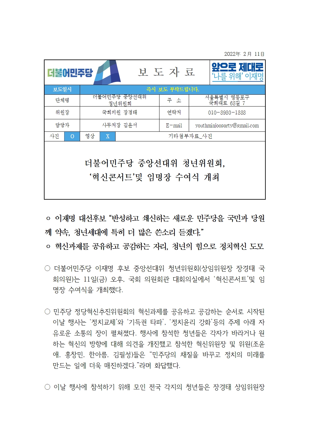 [보도자료] 더불어민주당 선대위 청년위원회, 혁신콘서트 및 임명장 수여식 개최