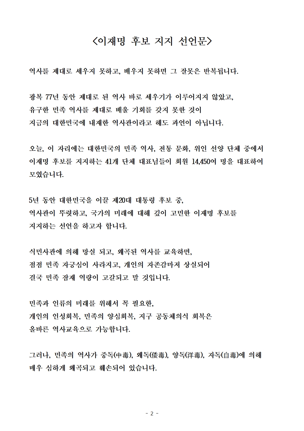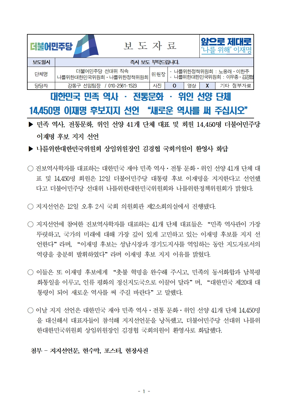 [보도자료] 더불어민주당 선대위 나를위한대한민국위원회·나를위한정책위원회, 진보역사학자 등 14,450명 후보 지지 선언
