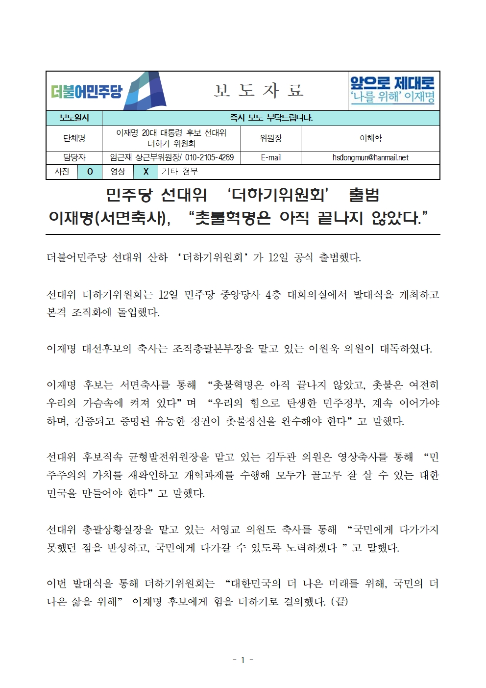 [보도자료] 더불어민주당 선대위 더하기위원회 출범