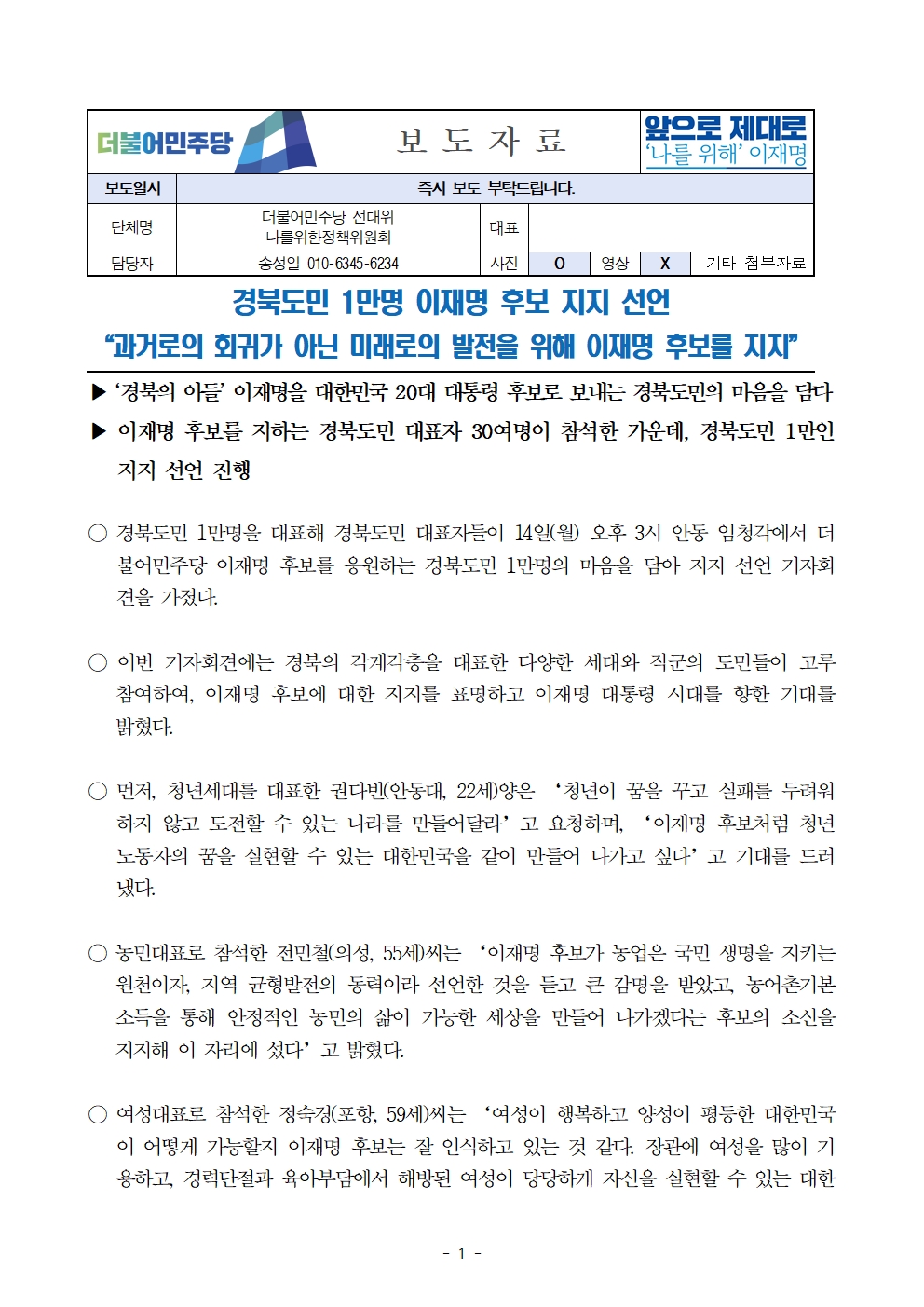 [보도자료] 더불어민주당 선대위 나를위한정책위원회, 경북도민 1만 명 후보 지지 선언