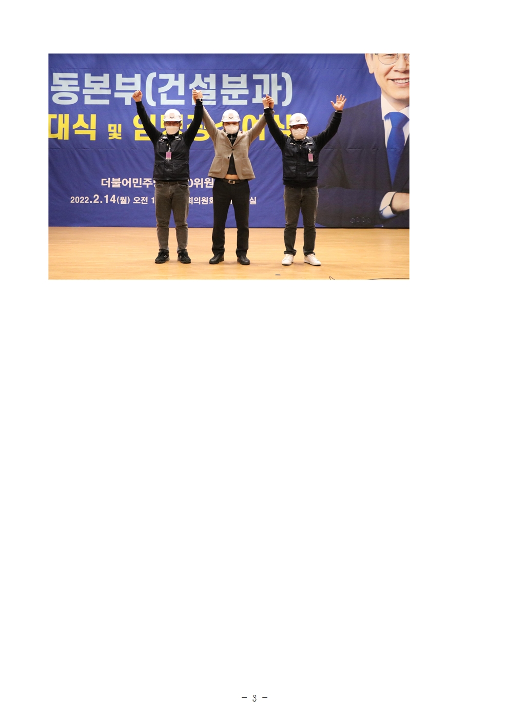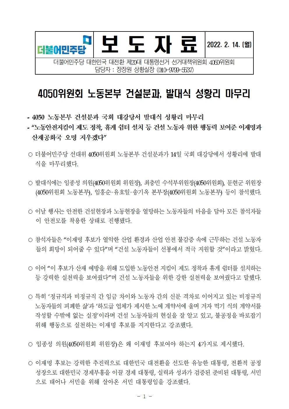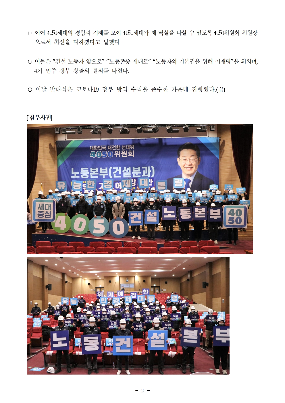 [보도자료] 더불어민주당 선대위 4050위원회, 노동본부 건설분과 발대식 개최