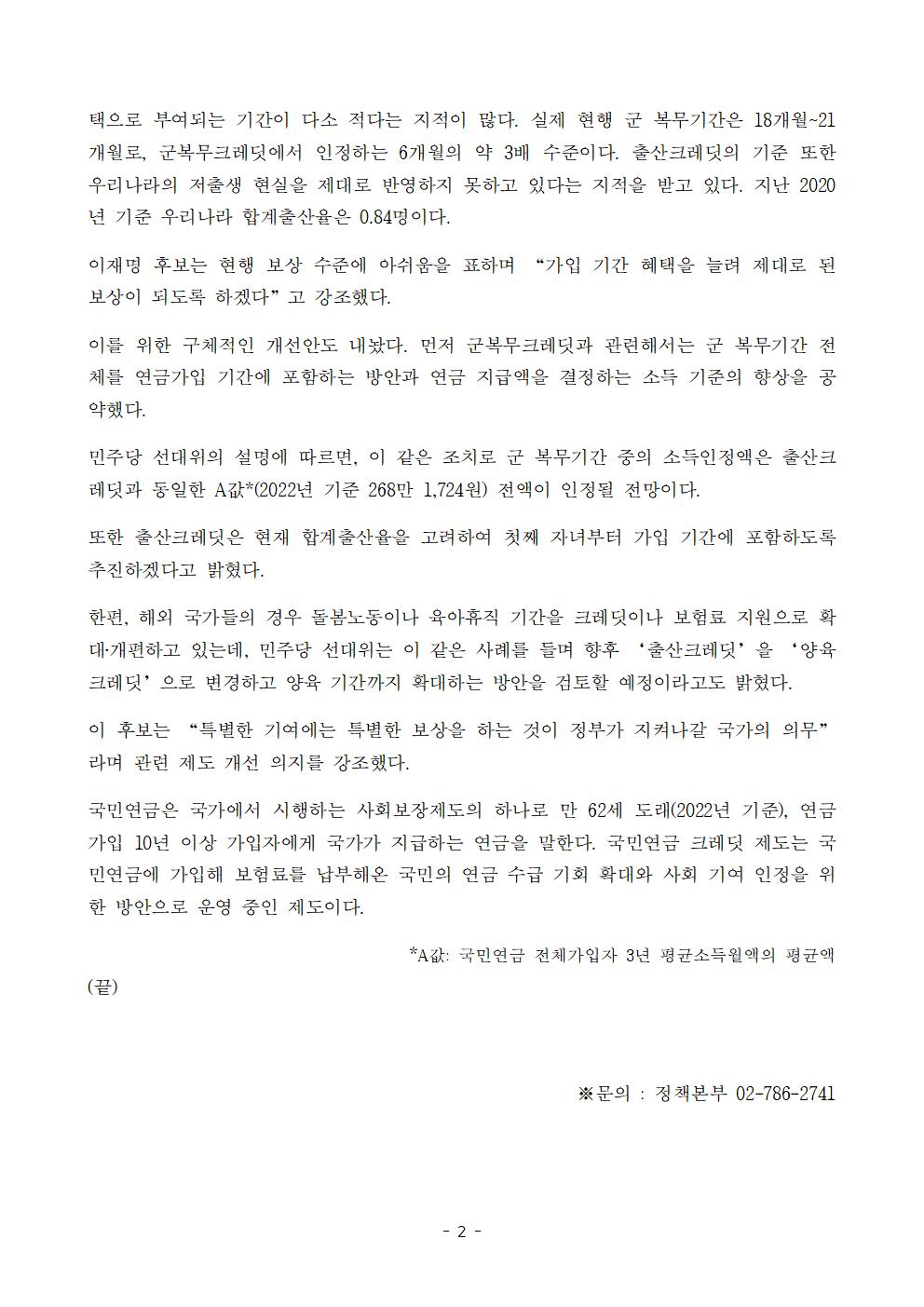 [보도자료] 더불어민주당 선대위 정책본부, '이재명은 합니다. 소확행 공약 시리즈 72' 국민연금 크레딧 제도 개선 공약 발표