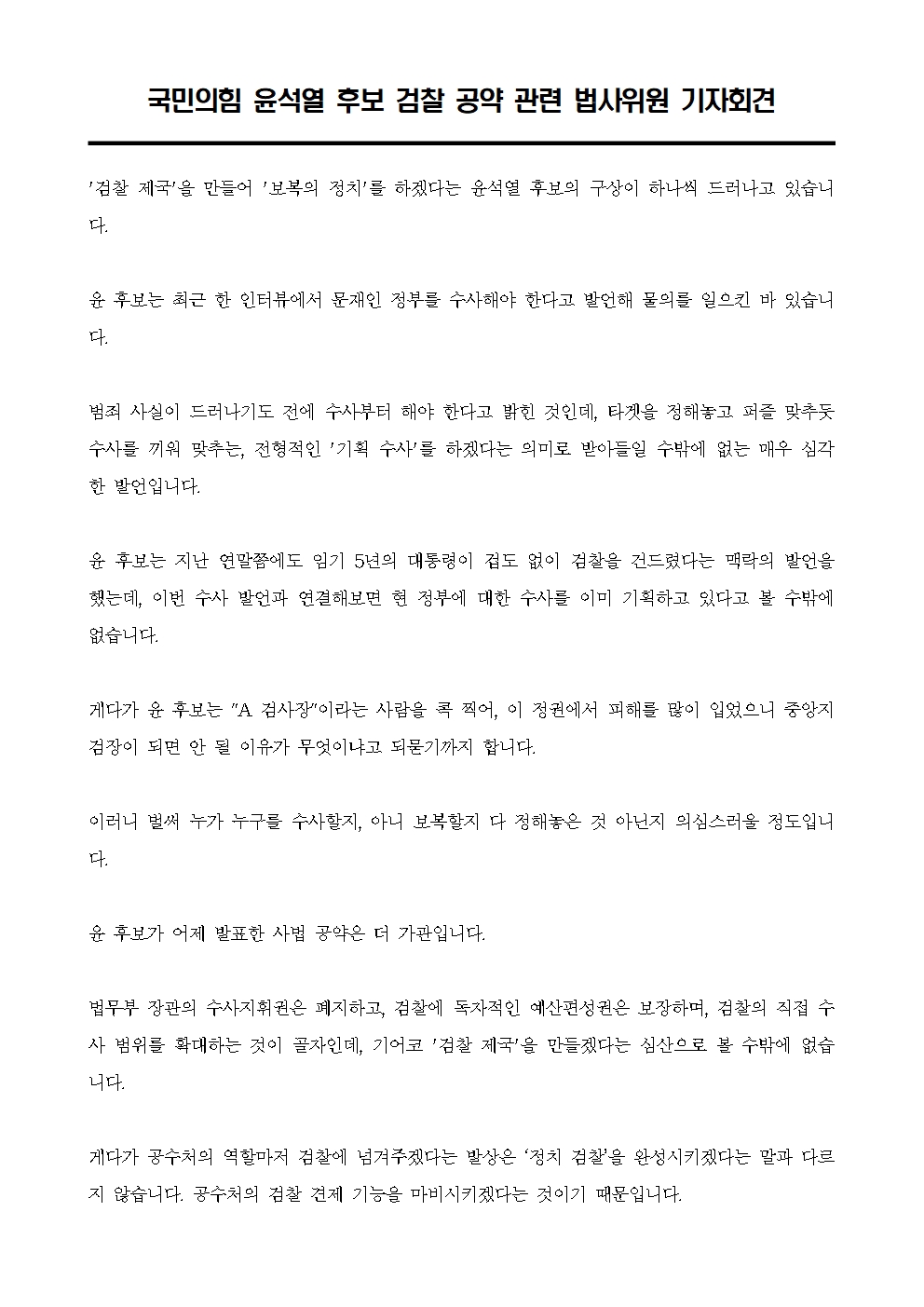 [기자회견문] 국민의힘 윤석열 후보 검찰 공약 관련 법사위원 기자회견