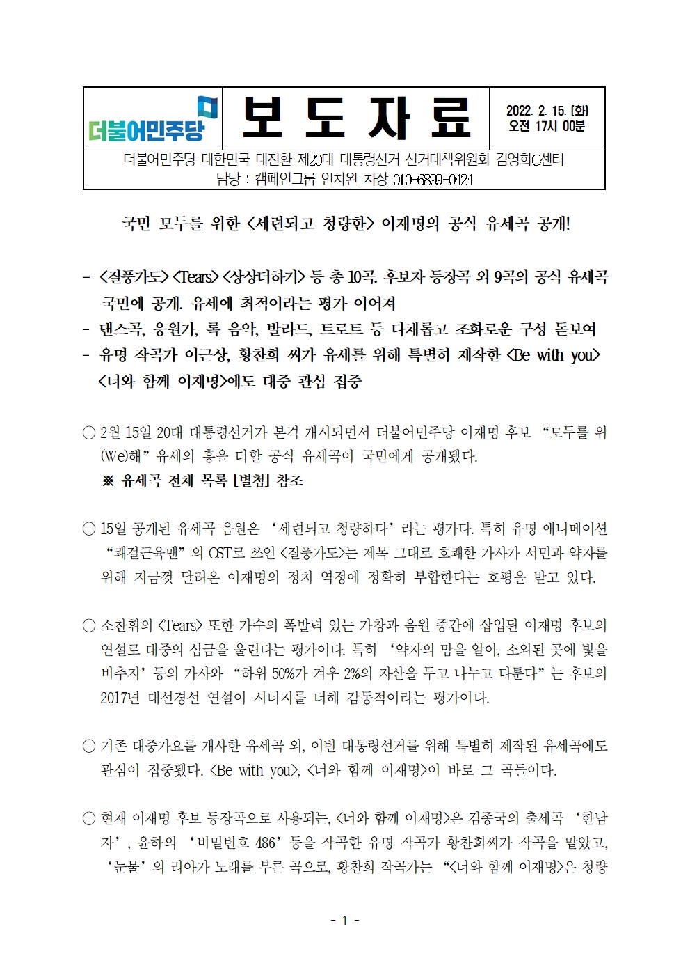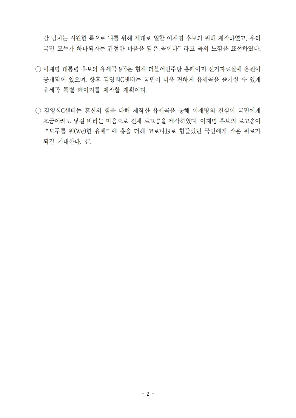 [보도자료] 더불어민주당 중앙선대위 김영희C센터, 국민 모두를 위한 '세련되고 청량한' 이재명의 공식 유세곡 공개
