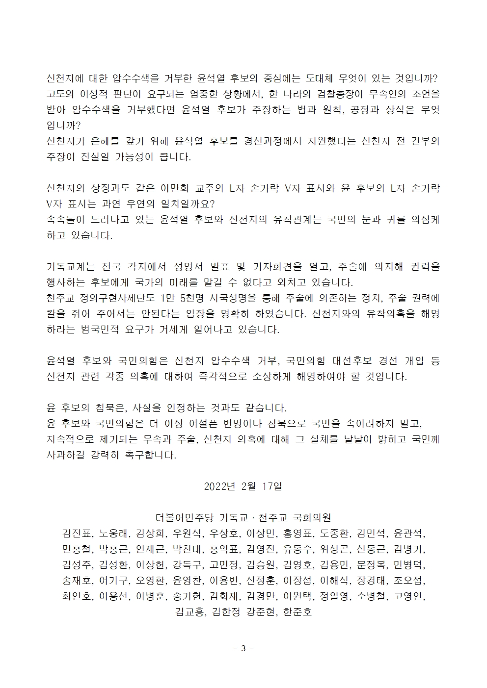 [보도자료] 더불어민주당 선대위 종교위원회, '윤석열 후보는 신천지와의 유착 의혹에 대해 명명백백하게 해명하라' 기자회견문