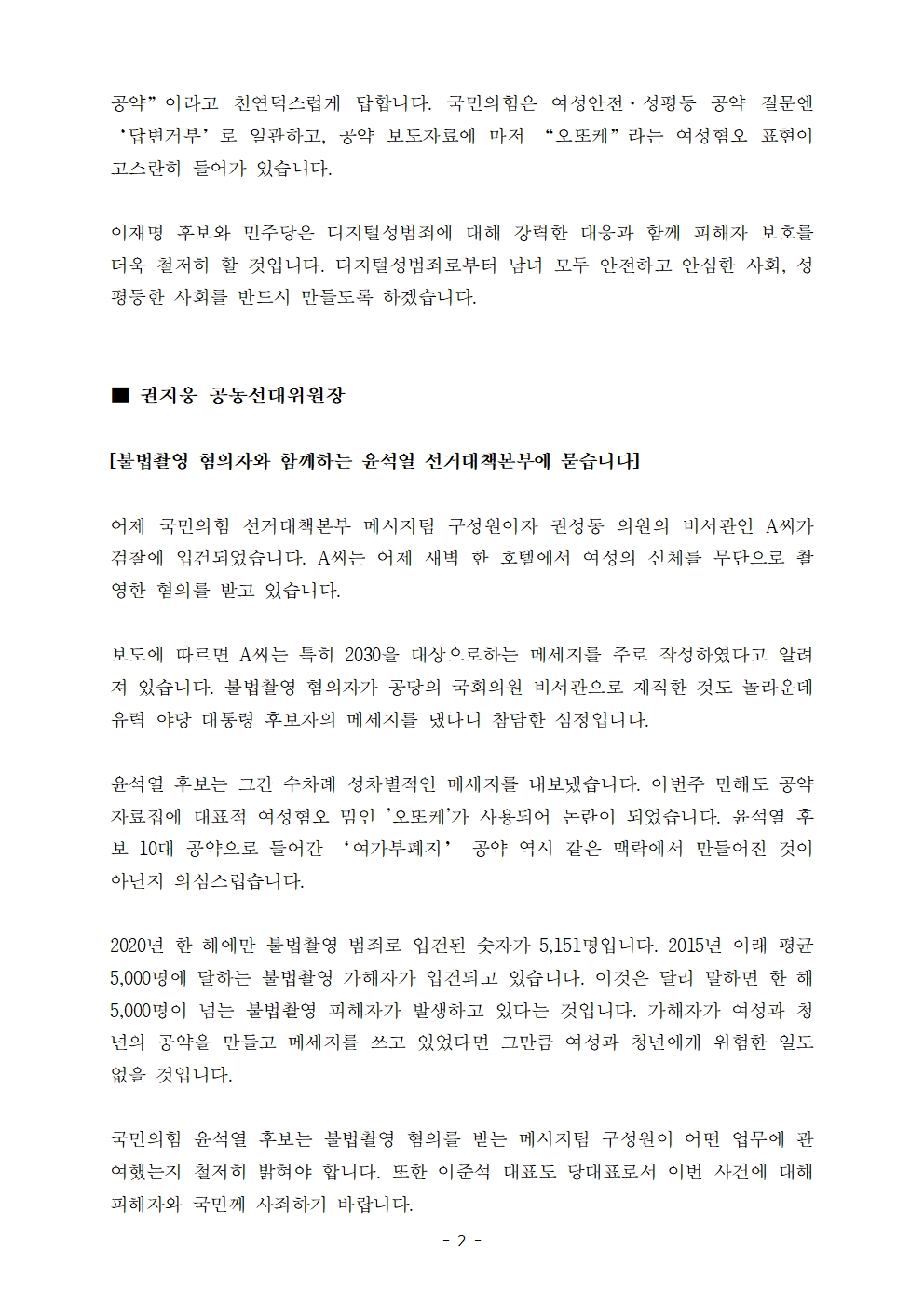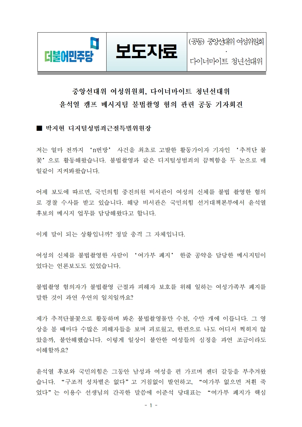 [보도자료] 중앙선대위 여성위원회 · 다이너마이트 청년선대위, 윤석열 캠프 메시지팀 불법촬영 혐의 관련 공동 기자회견