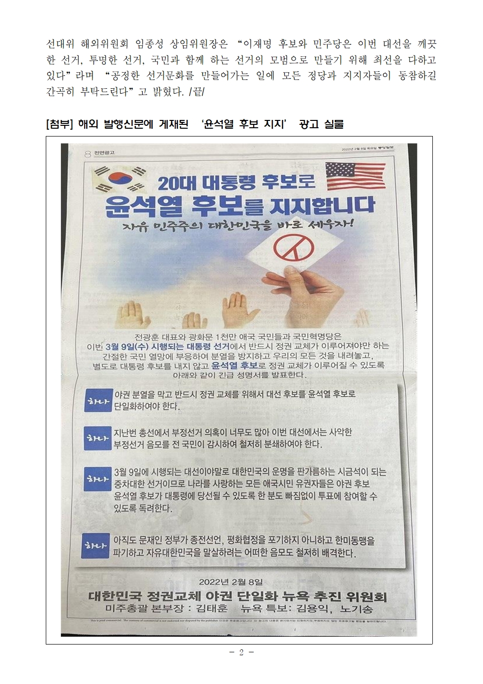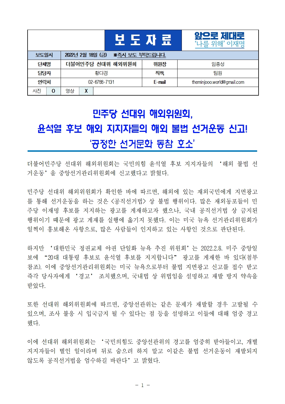 [보도자료] 더불어민주당 선대위 해외위원회, 윤석열 후보 해외 지지자들의 해외 불법 선거운동 신고