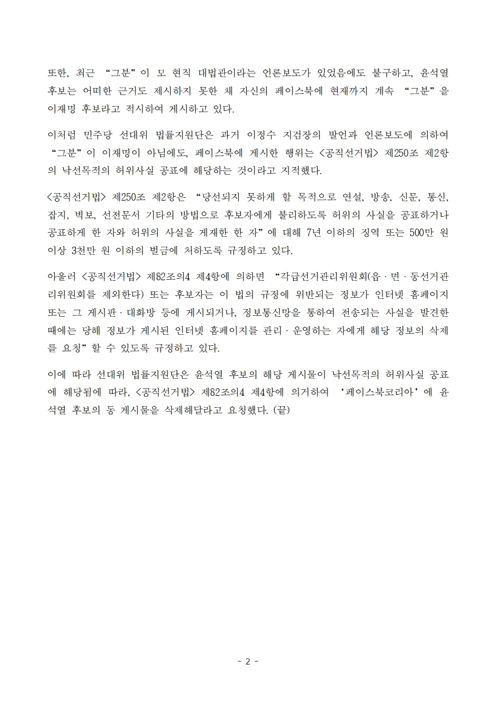 [보도자료] 더불어민주당 선대위 국민검증법률지원단, 윤석열 후보 페북 주장에 대해 허위사실 공표로 선관위 신고