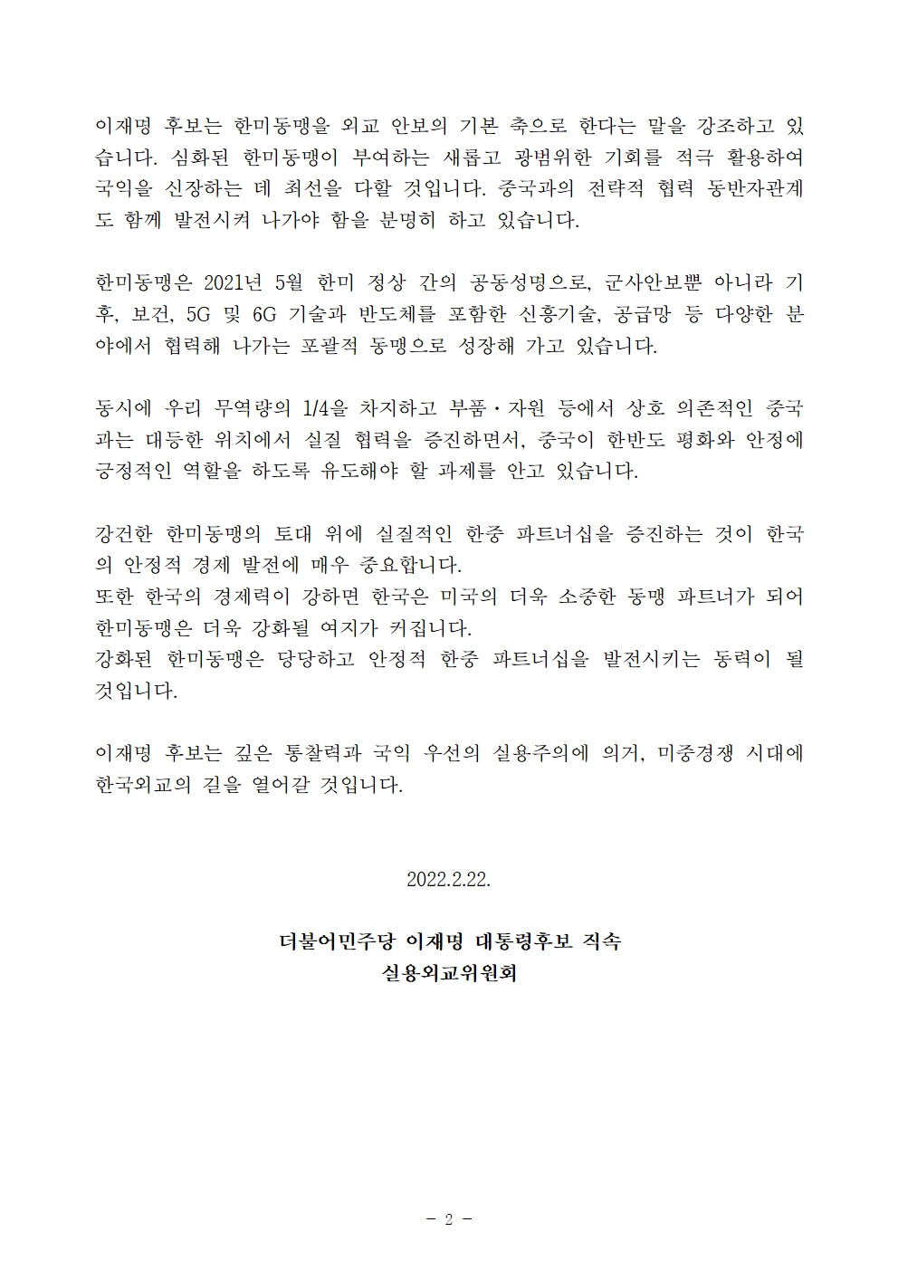 [성명서] 더불어민주당 선대위 실용외교위원회, 윤후보는 한미·한중 간에 틈을 벌려 취하려는 이득이 무엇입니까? 미중경쟁 시대에 한국외교의 갈 길은 정파를 넘어 만들어가야 합니다.