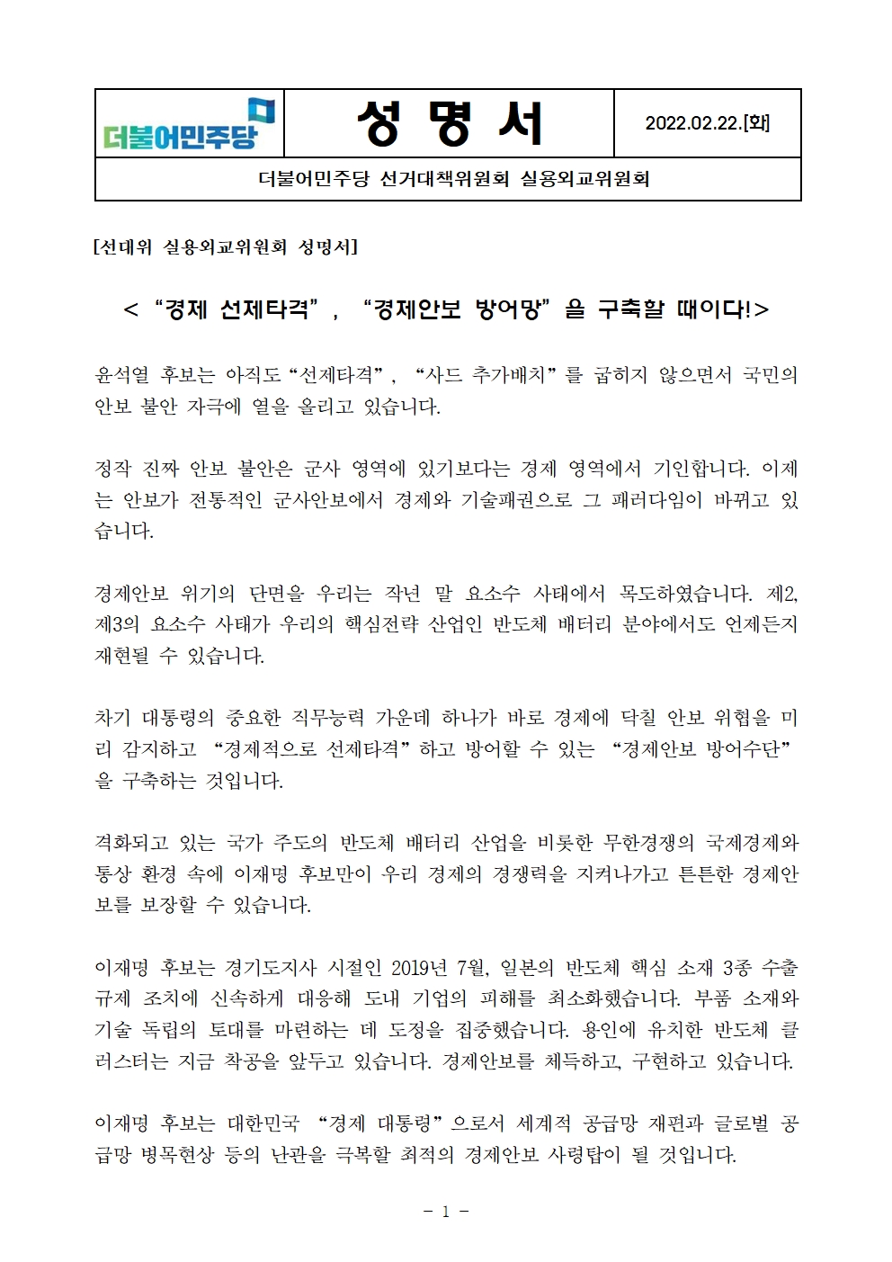 [성명서] 더불어민주당 선대위 실용외교위원회, '경제 선제타격', '경제안보 방어망'을 구축할 때이다!