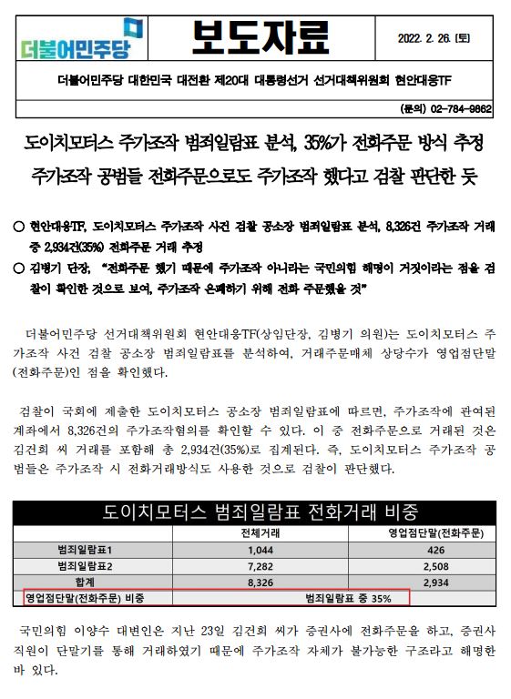 [보도자료] (더불어민주당 선대위 현안대응TF) 도이치모터스 주가조작 범죄일람표 분석, 35%가 전화주문 방식 추정. 주가조작 공범들 전화주문으로도 주가조작 했다고 검찰 판단한 듯