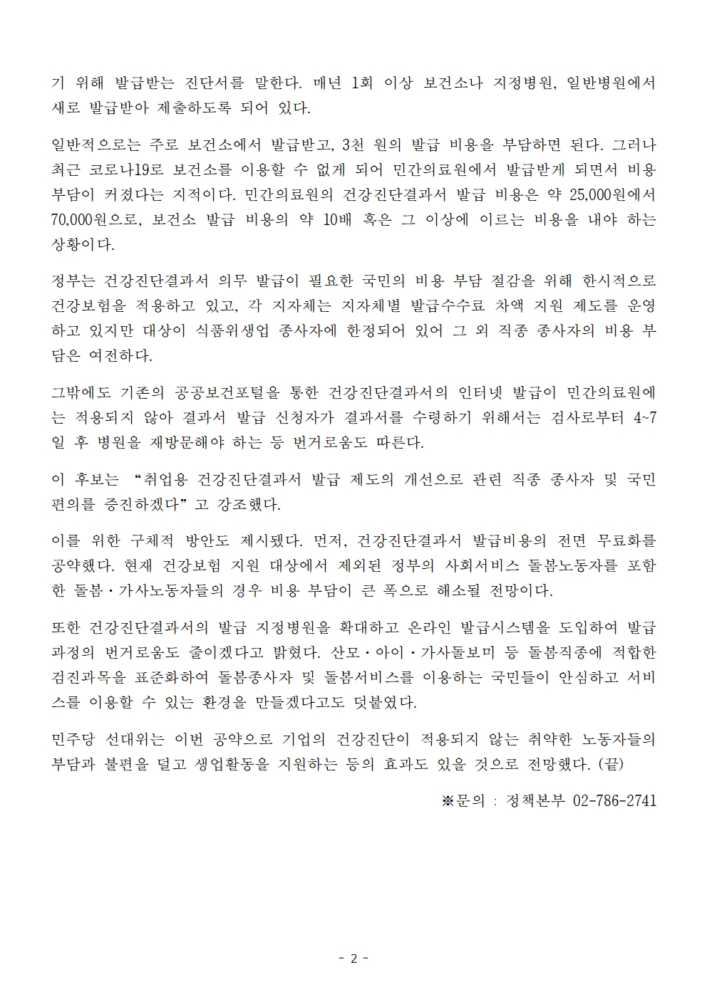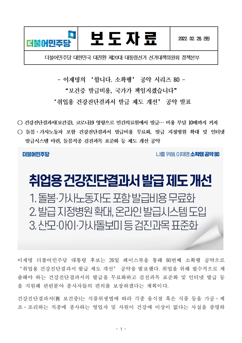 [보도자료] 더불어민주당 선대위 정책본부, '이재명은 합니다. 소확행 공약 시리즈 80' 취업용 건강진단결과서 발급 제도 개선 공약 발표