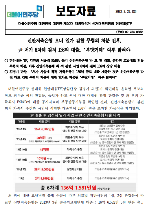 [보도자료] (더불어민주당 선대위 현안대응TF) 신안저축은행 오너 일가 검찰 무혐의 처분 전후, 尹 처가 6차례 걸쳐 136억 대출..‘부당거래’ 여부 밝혀야