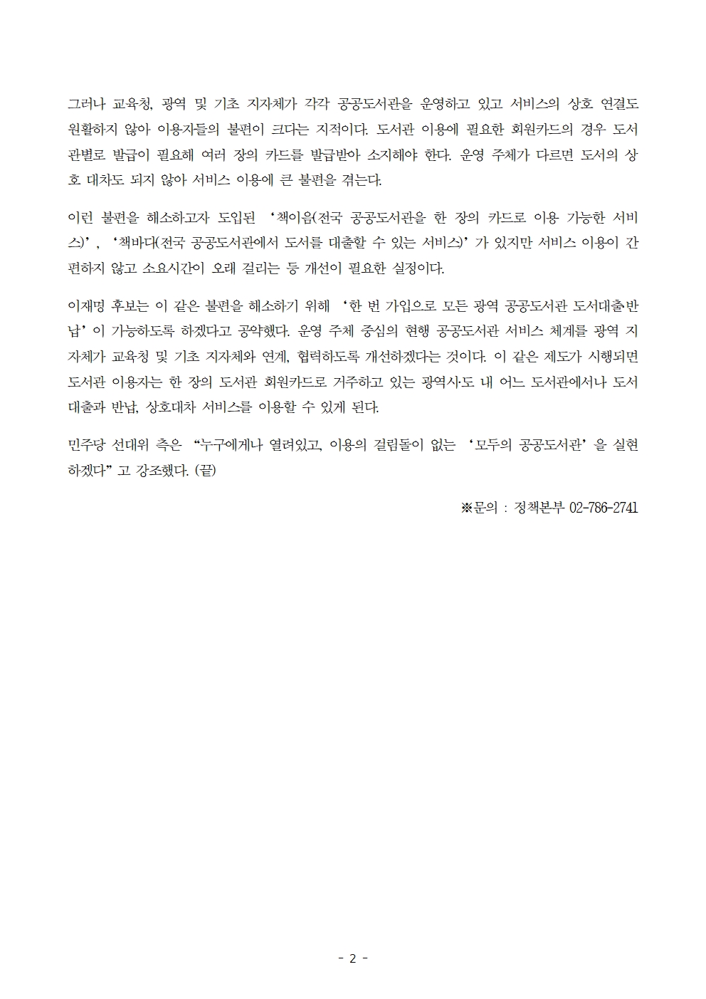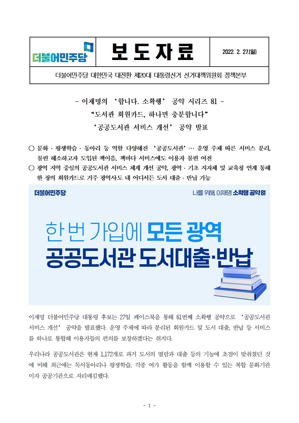[보도자료] 더불어민주당 선대위 정책본부, '이재명은 합니다. 소확행 공약 시리즈 81' 공공도서관 서비스 개선 공약 발표