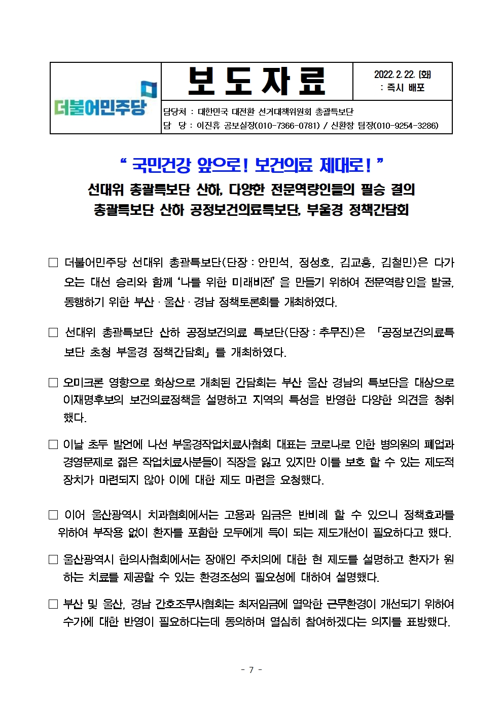 [보도자료] 더불어민주당 선대위 총괄특보단, 학부모·청년·월남참전 유공자 지지선언 및 공정보건의료특보단 부울경 정책간담회 개최