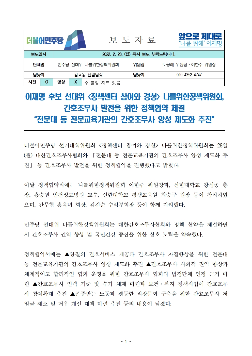 [보도자료] 더불어민주당 선대위 나를위한정책위원회, 대한간호조무사협회와 정책협약 체결