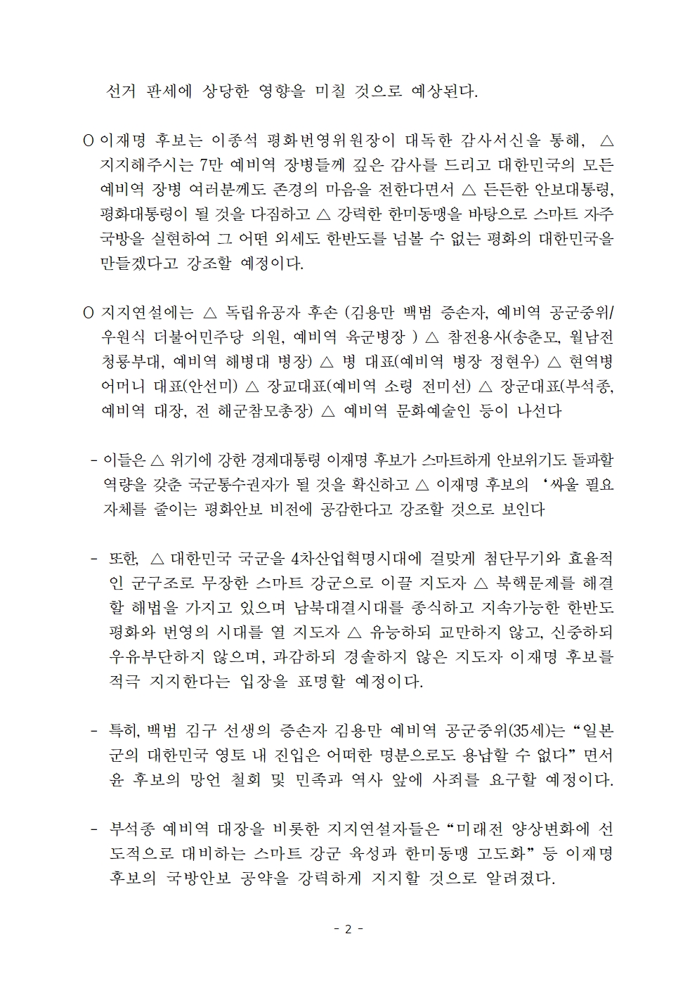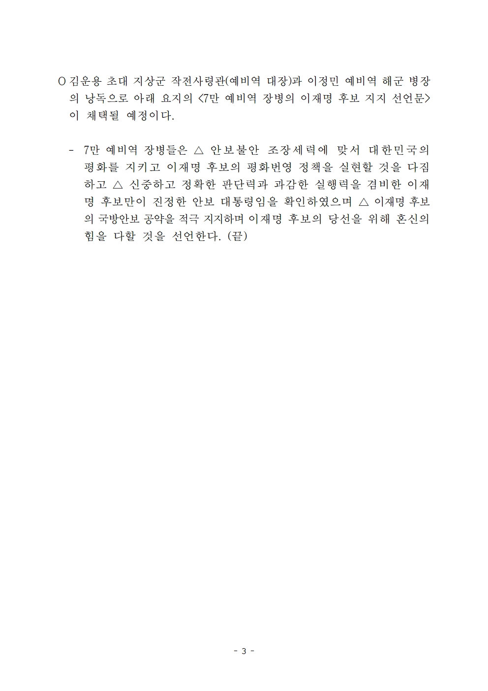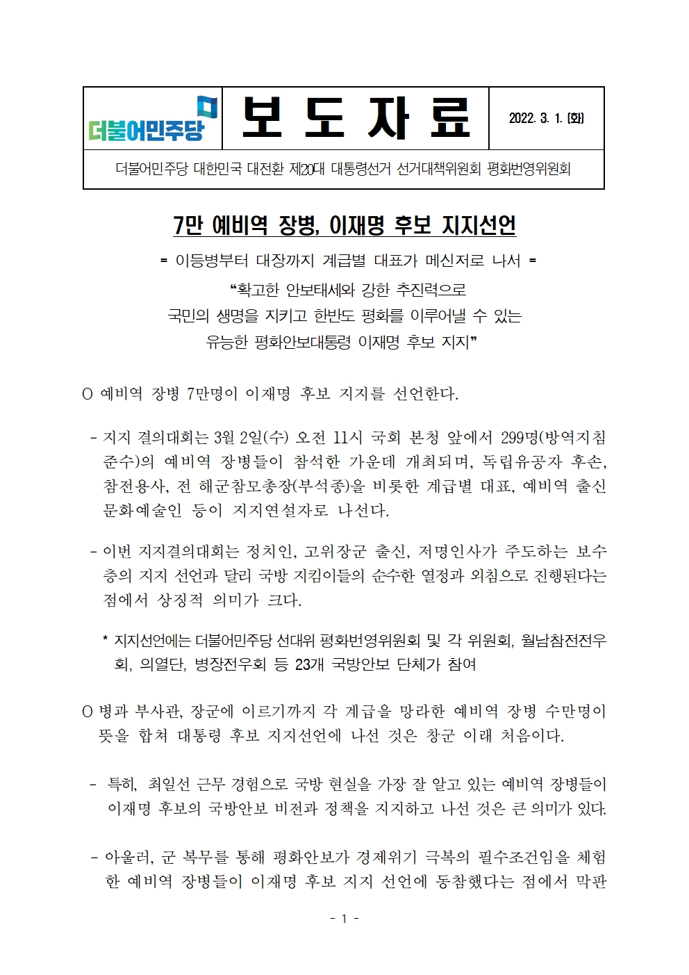 [보도자료] 더불어민주당 선대위 평화번영위원회, 7만 예비역 장병 후보 지지선언