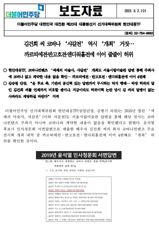 [보도자료] (더불어민주당 선대위 현안대응TF) 김건희 씨 코바나 ‘샤갈전’ 역시 ‘개최’ 거짓…까르띠에전‧반고흐전‧앤디워홀전에 이어 줄줄이 허위