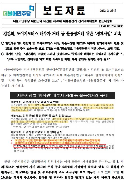 [보도자료] (더불어민주당 선대위 현안대응TF) 김건희, 도이치모터스 내부자 거래 등 불공정거래 위반 ‘경제사범’ 의혹