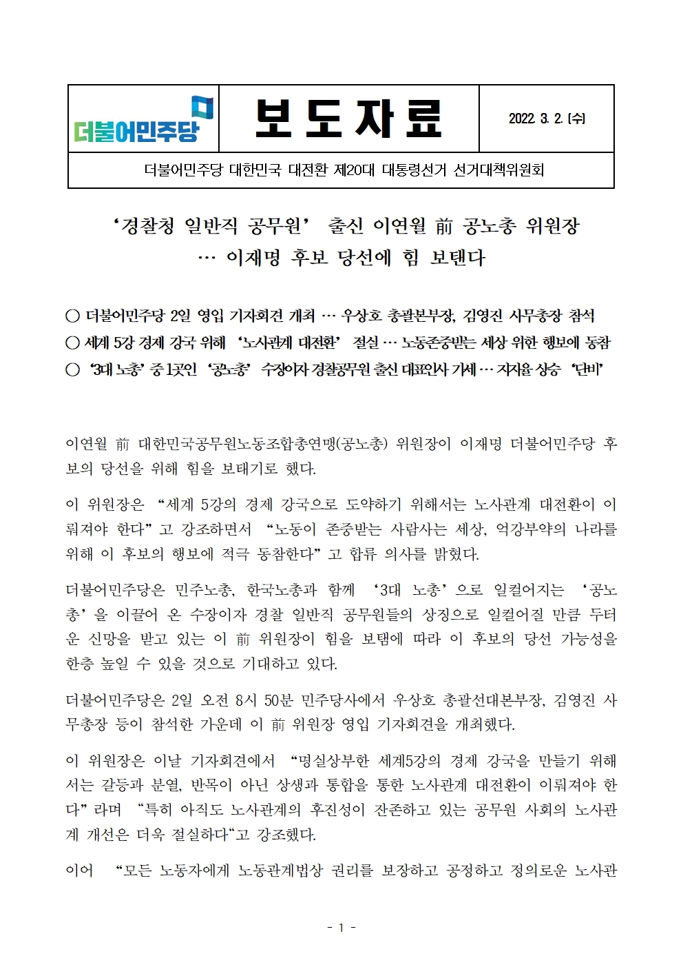 [보도자료] 더불어민주당 선대위, 이연월 전 공노총 위원장 영입 기자회견 개최