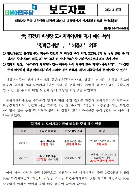 [보도자료] (더불어민주당 선대위 현안대응TF) 尹, 김건희 비상장 도이치파이낸셜 저가 매수 특혜 '청탁금지법', '뇌물죄' 의혹