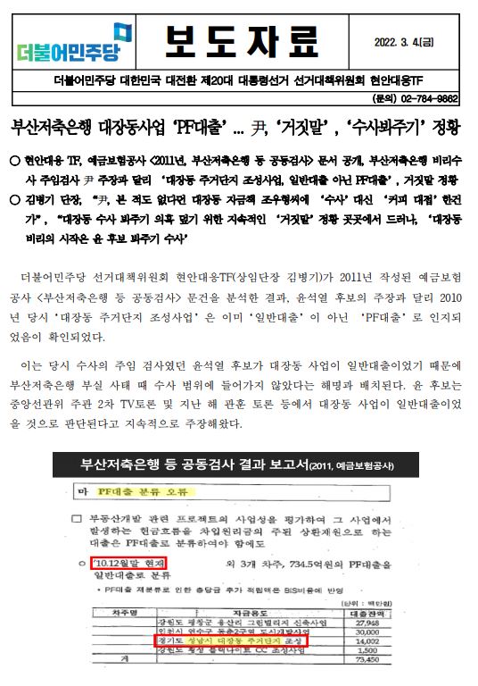 [보도자료] (더불어민주당 선대위 현안대응TF) 부산저축은행 대장동사업 ‘PF대출’ ... 尹, ‘거짓말’, ‘수사봐주기’ 정황