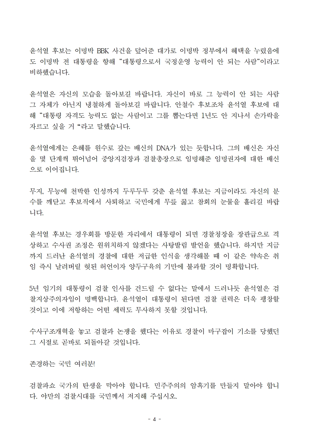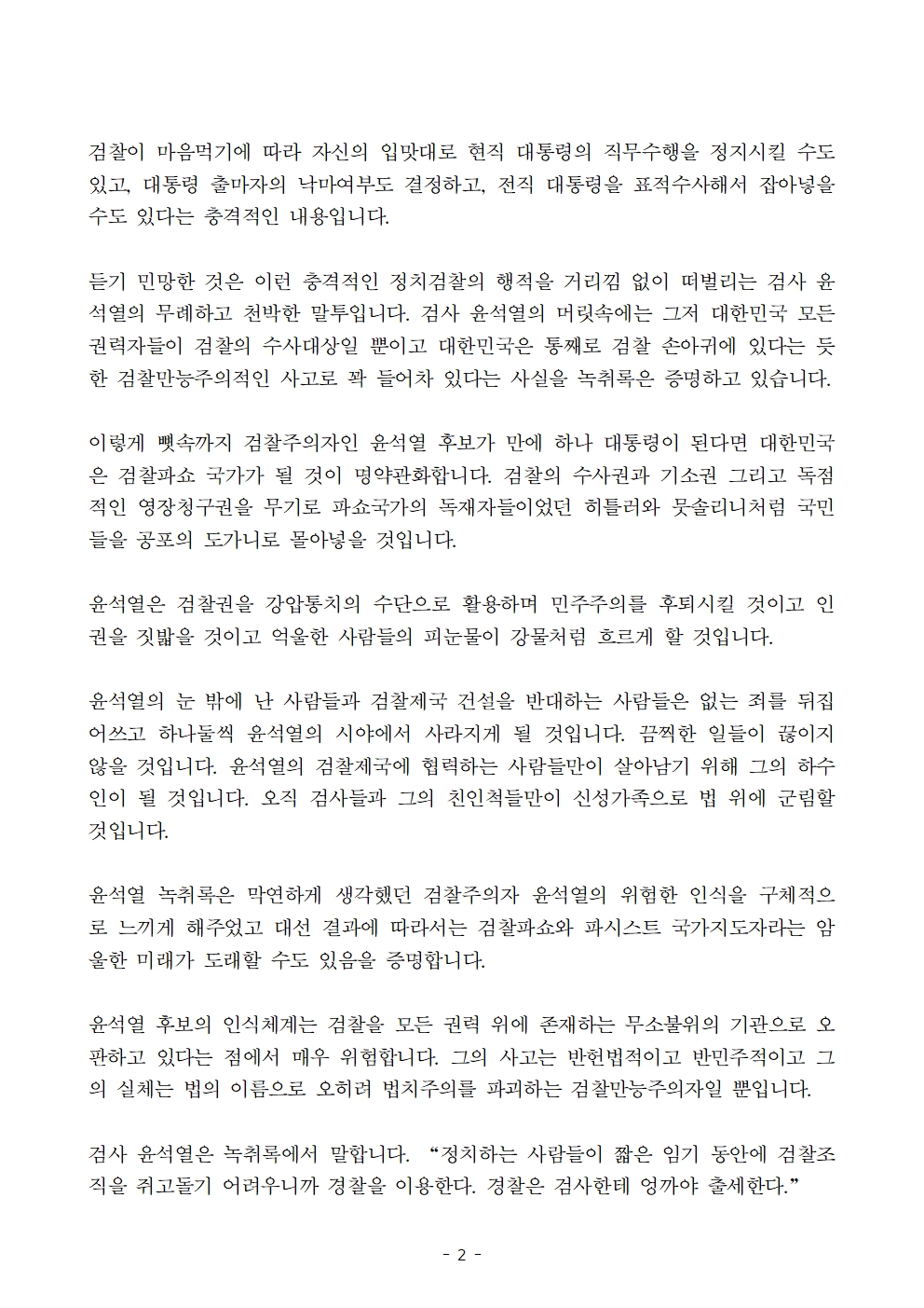 [기자회견문] 정치검찰 윤석열 후보 녹취록 관련 대국민 사과 촉구 기자회견