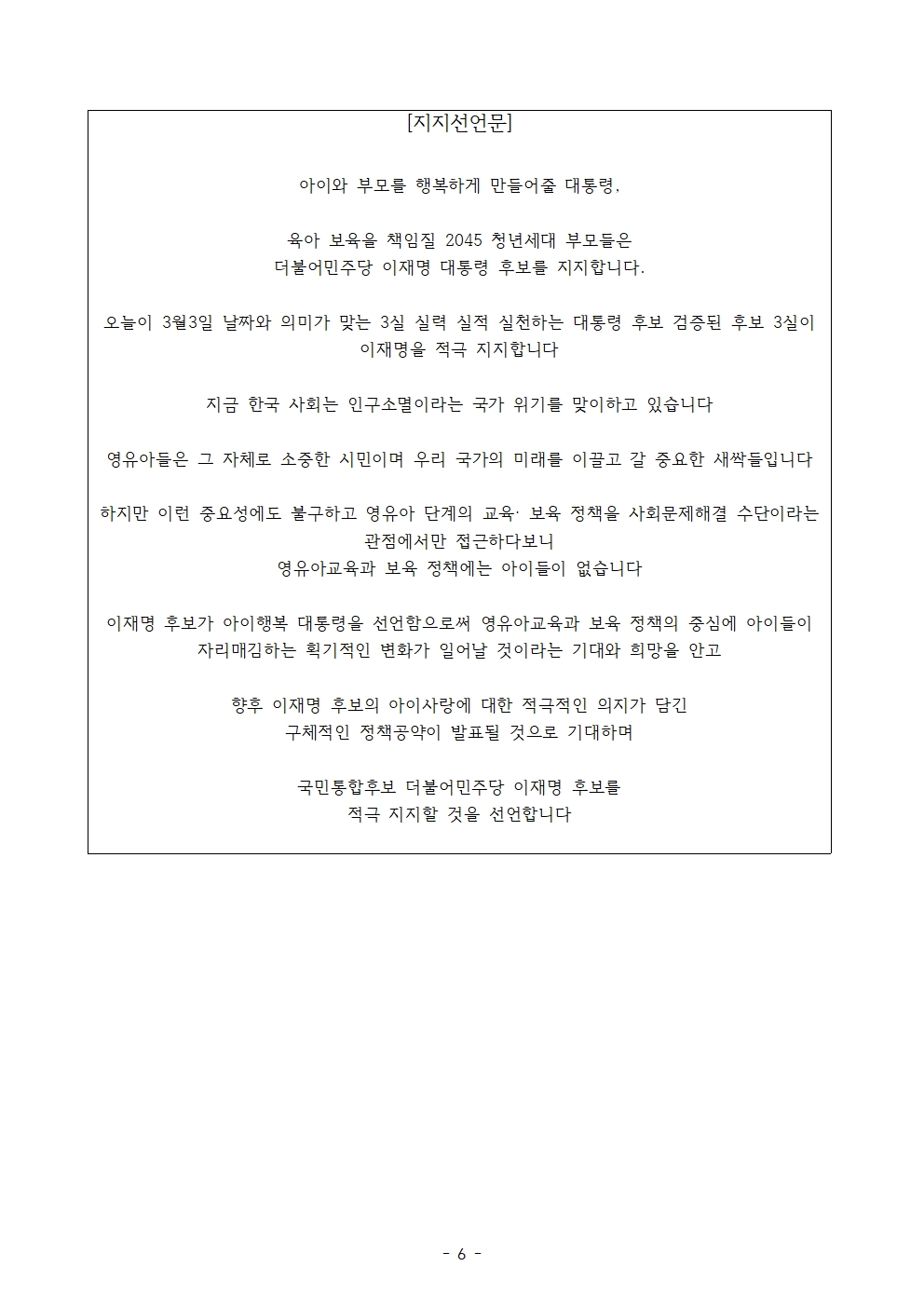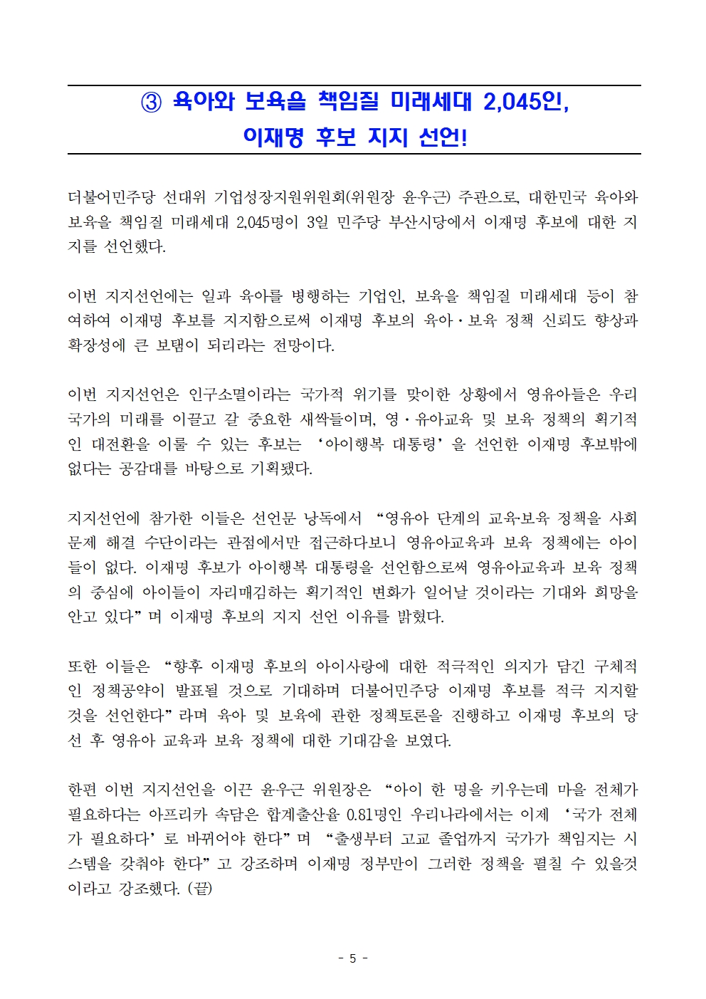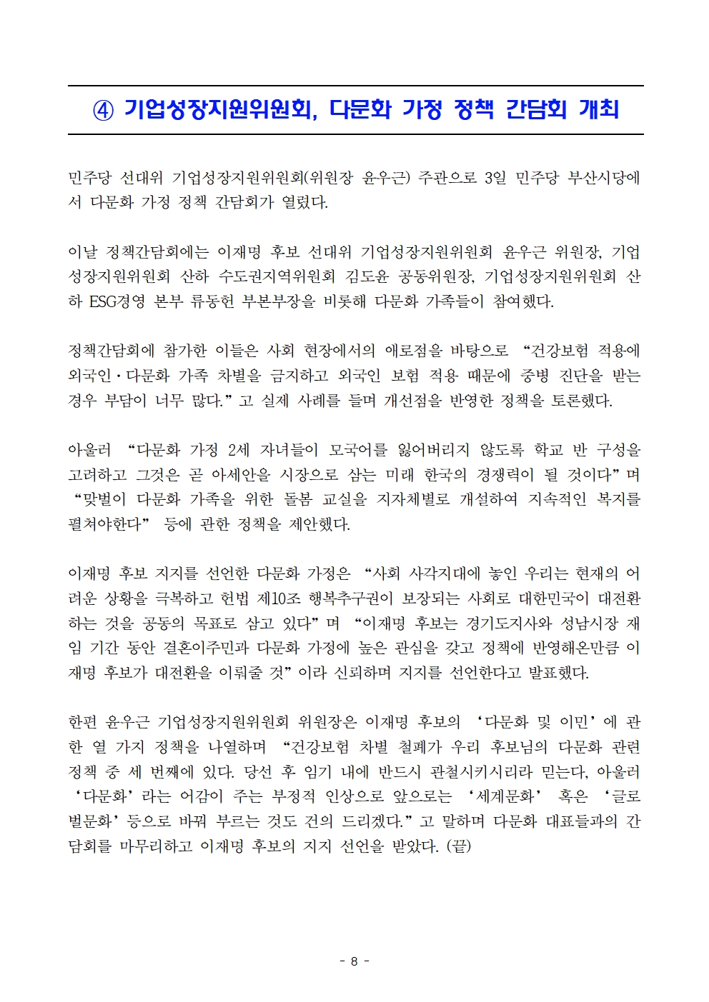 [보도자료] 더불어민주당 선대위 기업성장지원위원회, 기업인 101명·생애 첫 투표 청년 2532인·육아보육 책임질 미래세대 2,045인 후보 지지선언 및 다문화가정 정책간담회 개최