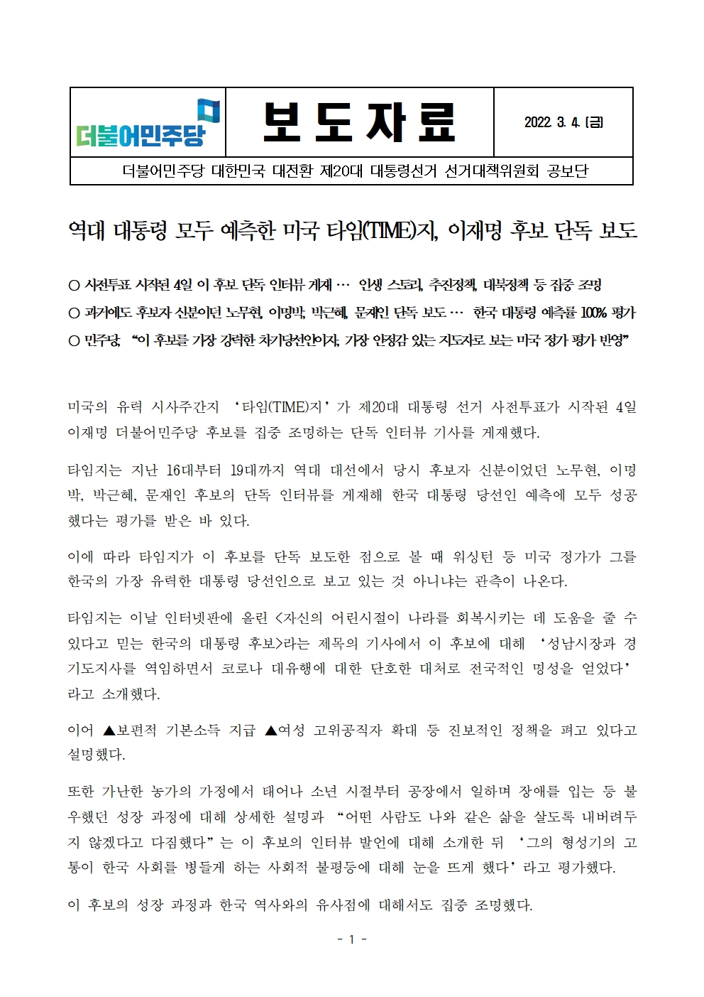 [보도자료] 더불어민주당 선대위 공보단, 역대 대통령 모두 예측한 미국 타임(TIME)지, 이재명 후보 단독 보도