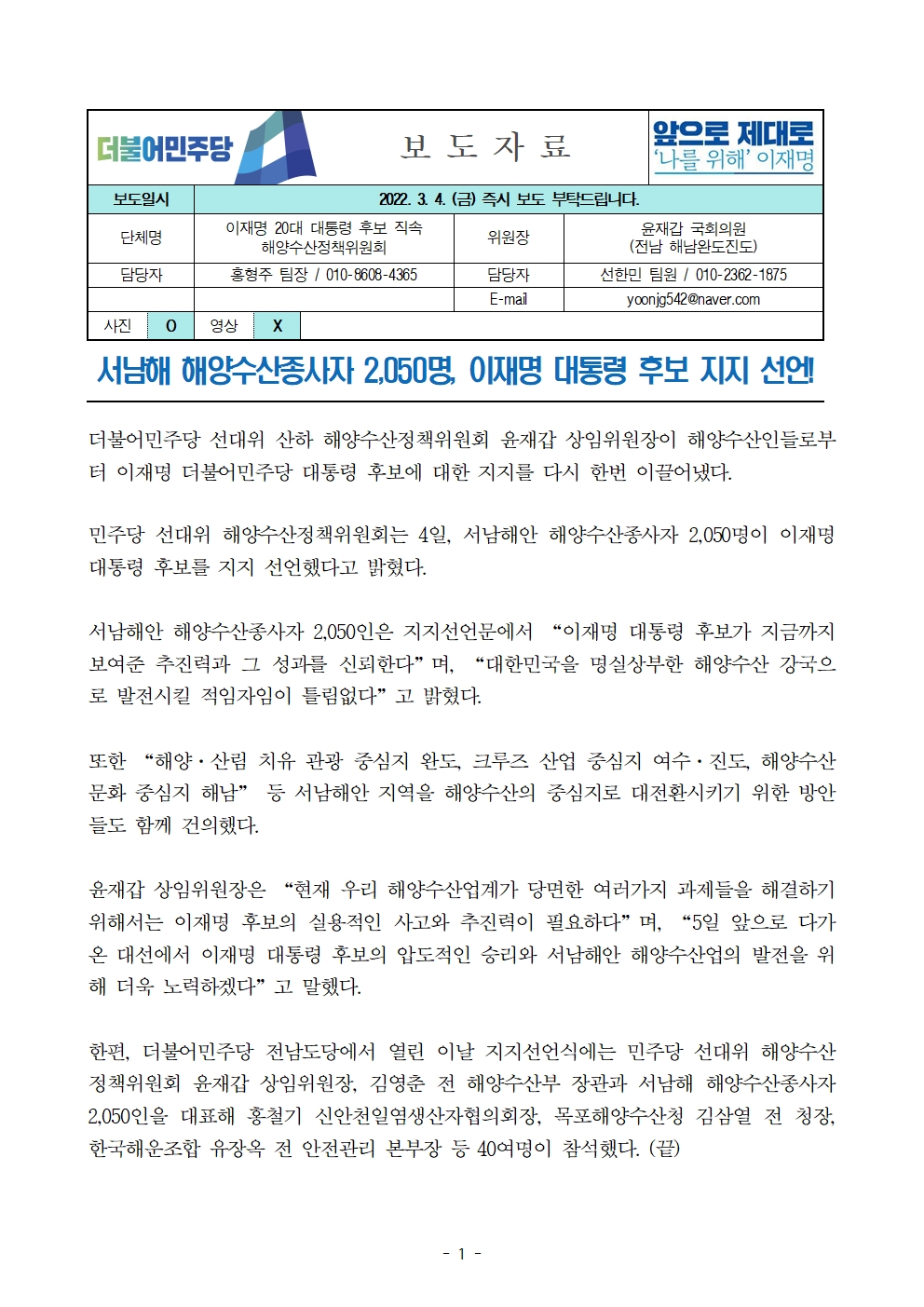[보도자료] 더불어민주당 선대위 해양수산정책위원회, 서남해 해양수산종사자 2,050명 후보 지지선언