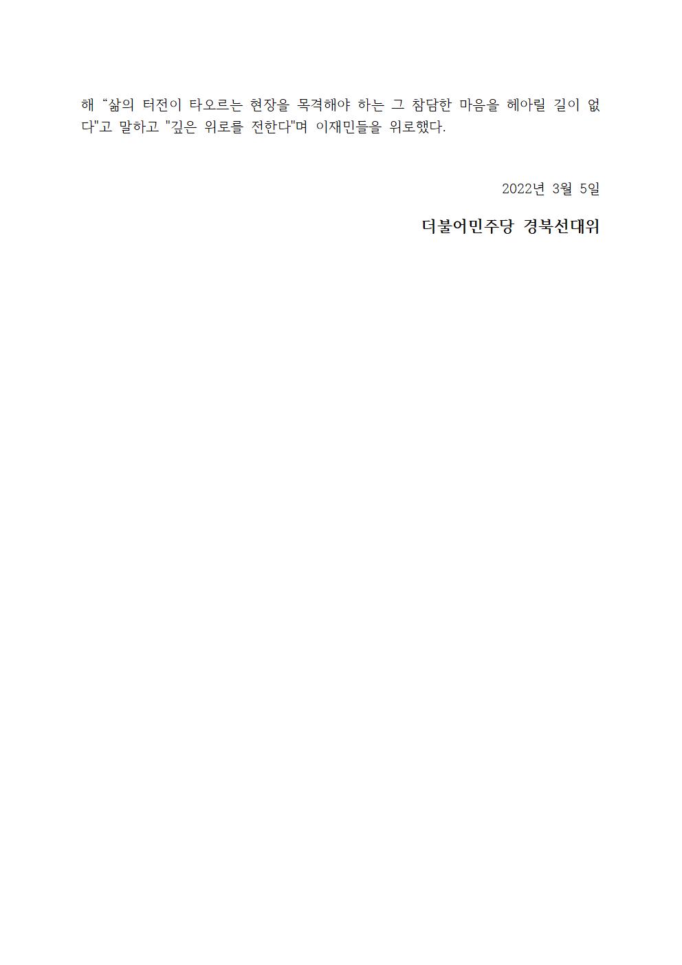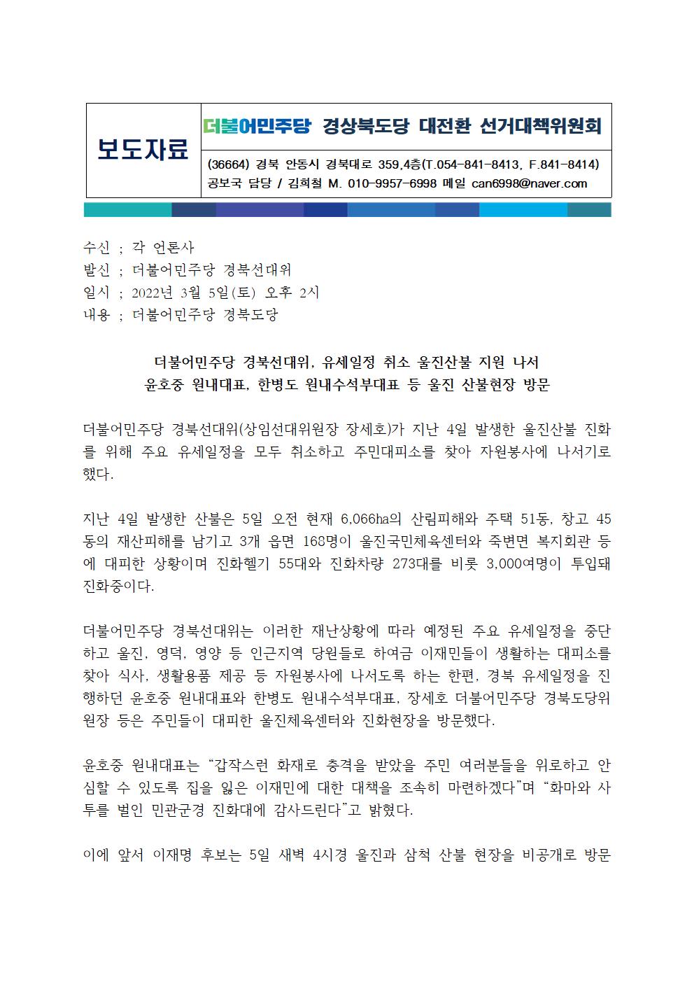[보도자료] 더불어민주당 경상북도당 선대위 유세일정 취소 울진산불 지원 나서
