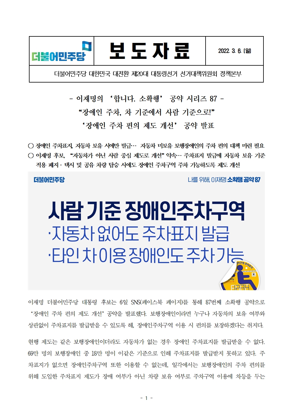 [보도자료] 더불어민주당 선대위 정책본부, '이재명은 합니다. 소확행 공약 시리즈 87' 장애인 주차 편의 제도 개선 공약 발표