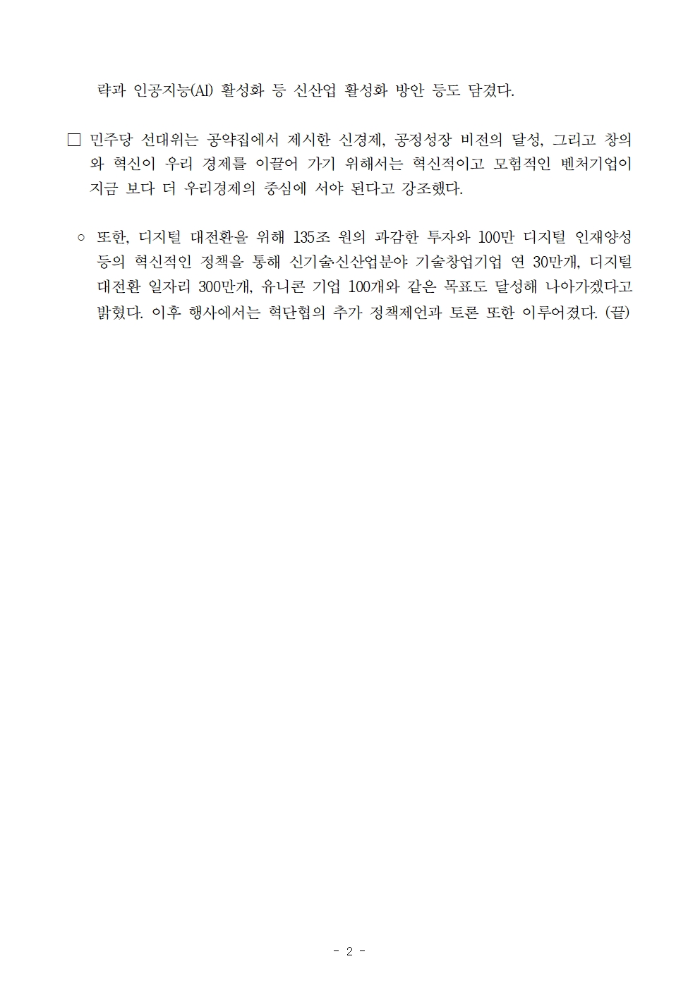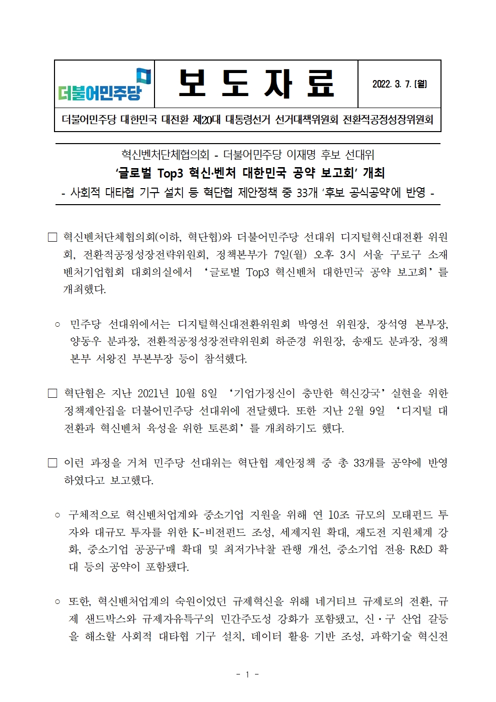 [보도자료] 더불어민주당 선대위 전환적공정성장위원회, 혁신벤처단체협의회와 ‘글로벌 Top3 혁신·벤처 대한민국 공약 보고회’ 개최