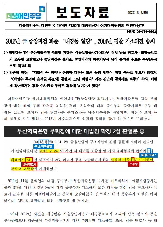 [보도자료] (더불어민주당 선대위 현안대응TF) 2012년 尹 중앙지검 봐준 ‘대장동 일당’, 2014년 경찰 기소의견 송치