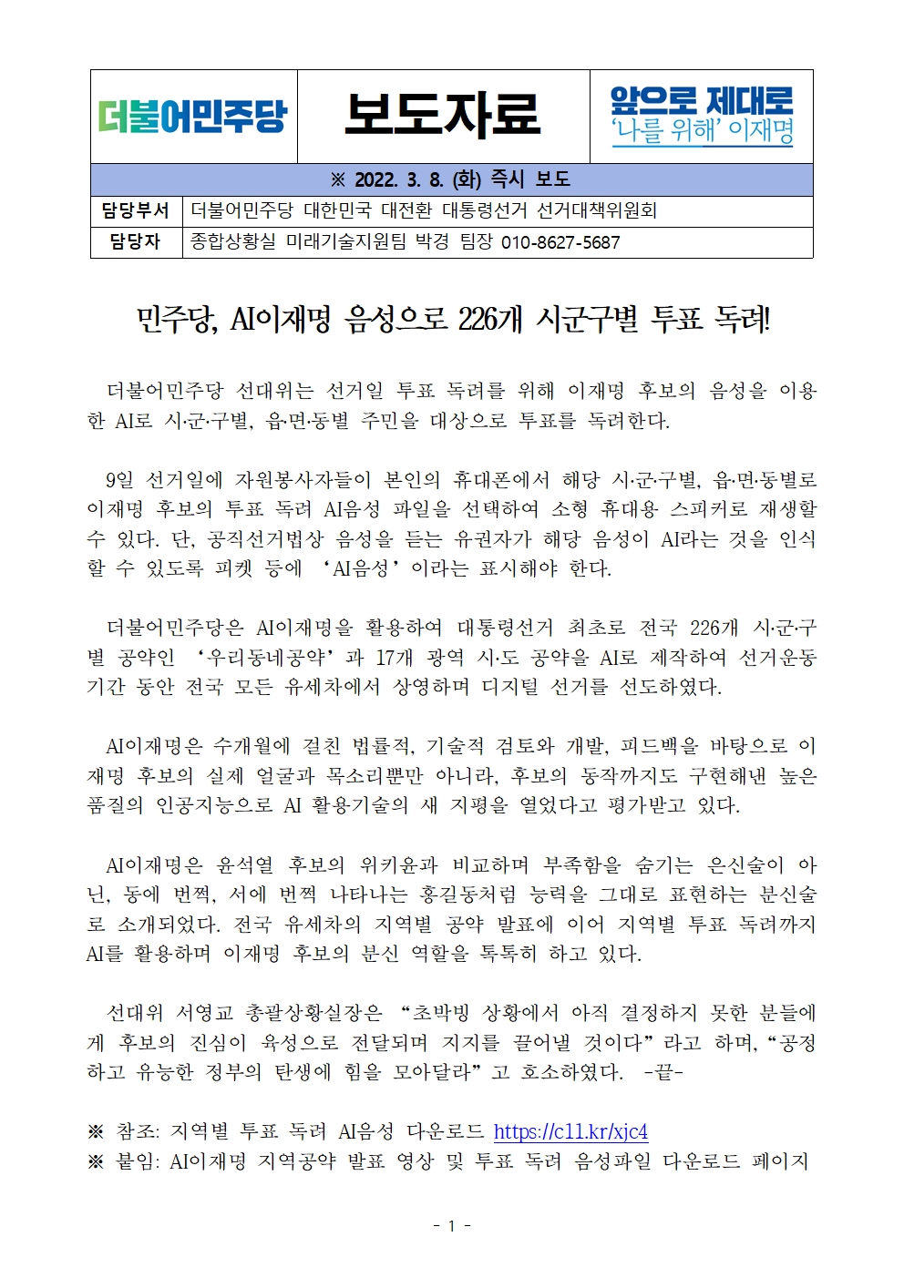 [보도자료] 더불어민주당 선대위, AI이재명 음성으로 226개 시군구별 투표 독려!
