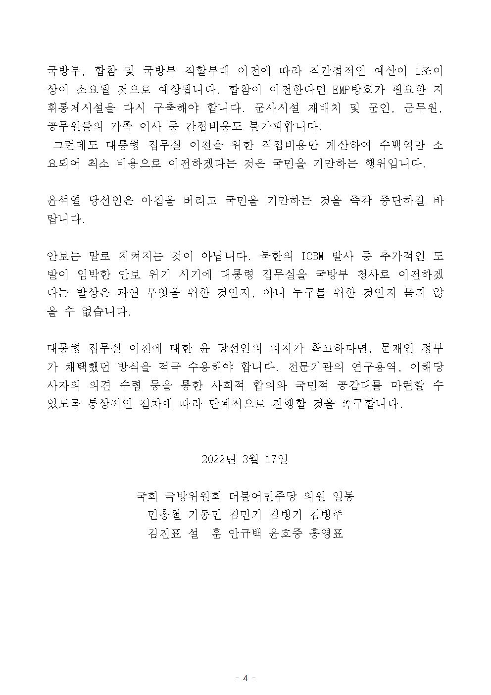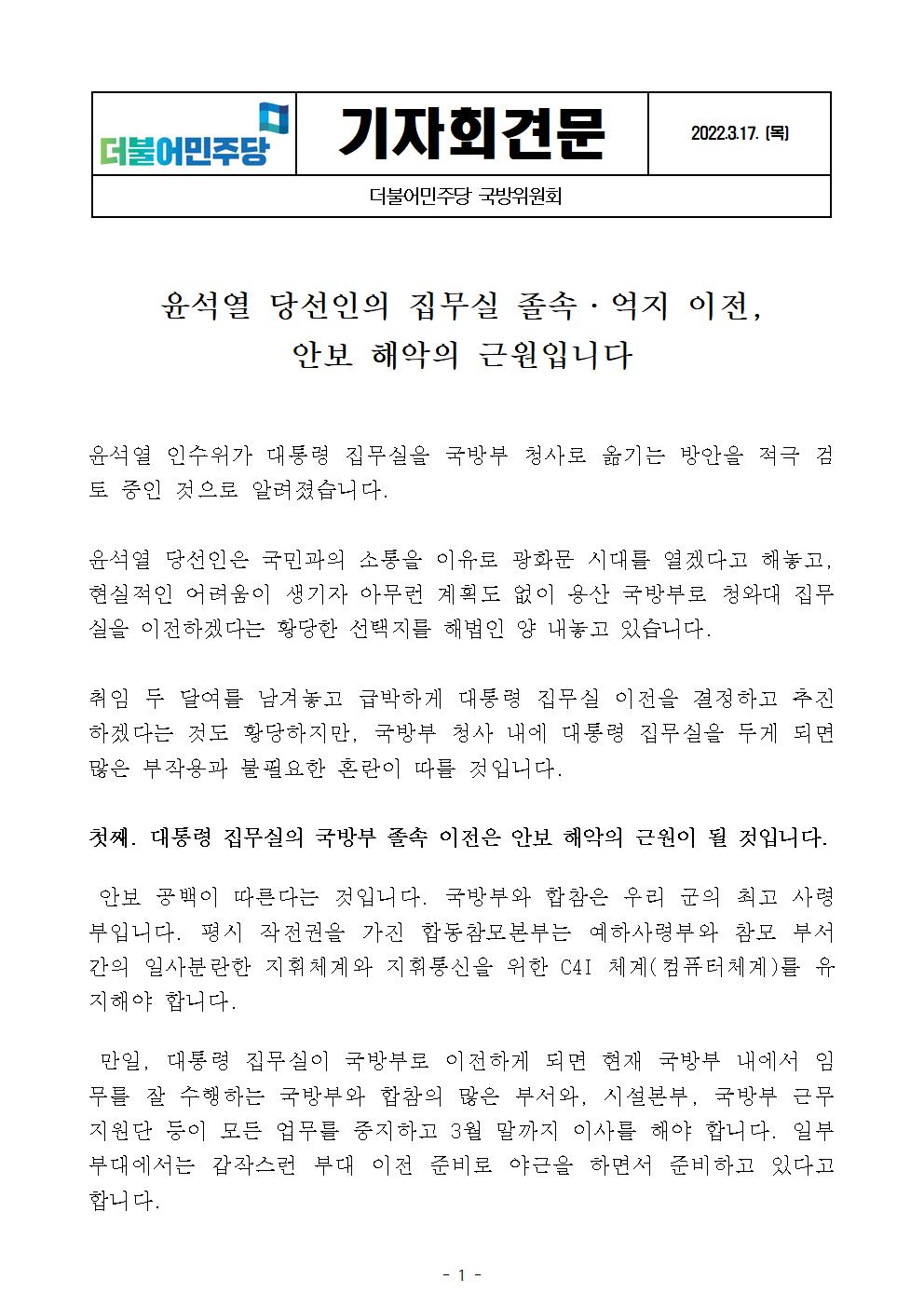 [기자회견문] 국회 국방위원회 더불어민주당 의원 일동, 윤석열 당선인의 집무실 졸속·억지 이전, 안보 해악의 근원입니다