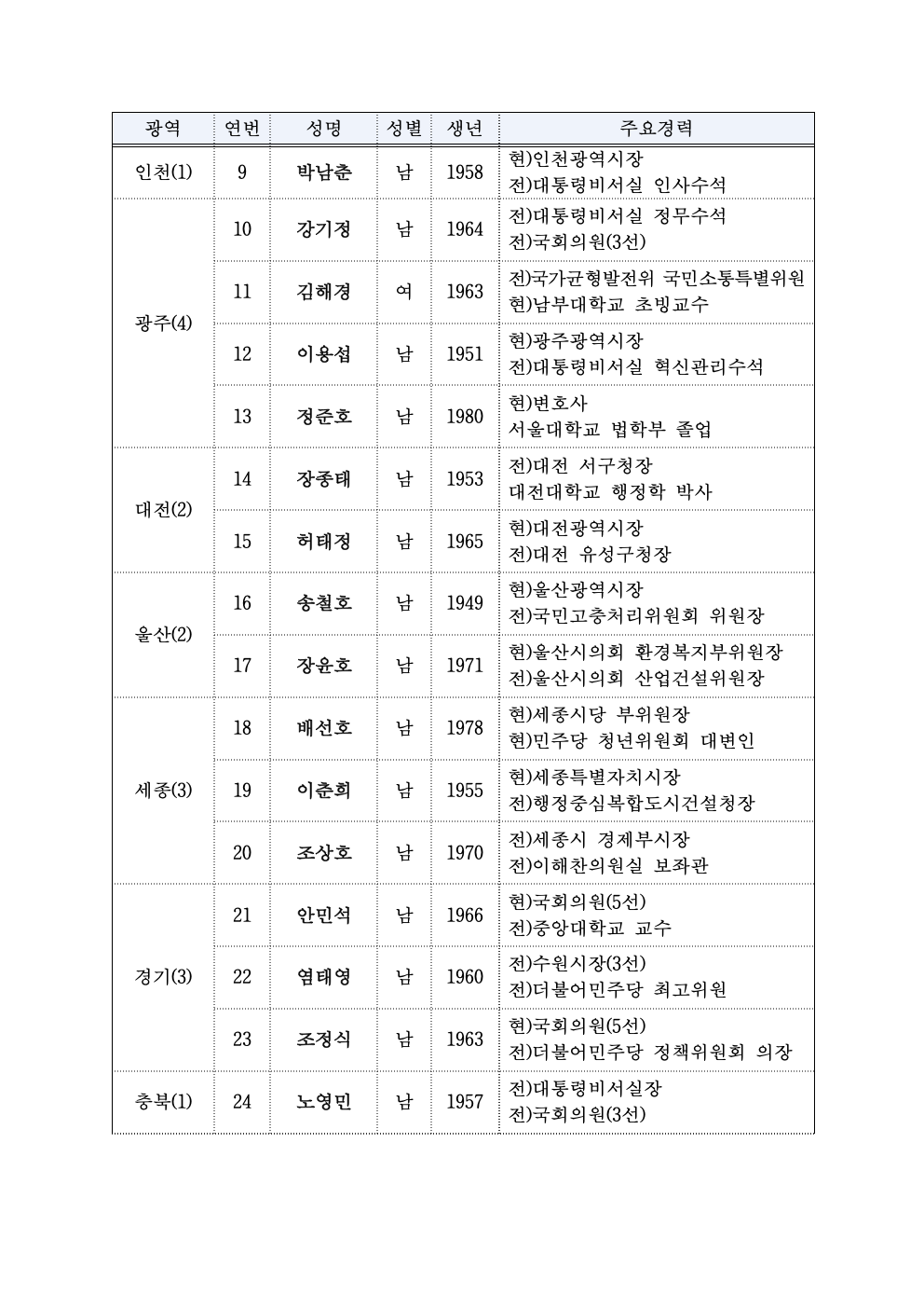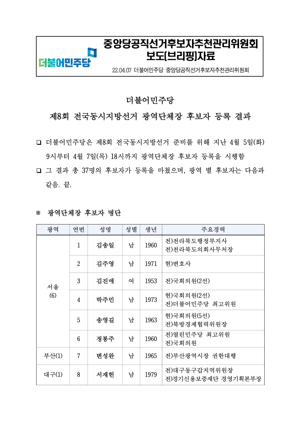 [보도자료]더불어민주당 제8회 전국동시지방선거 광역단체장 후보자 등록 결과