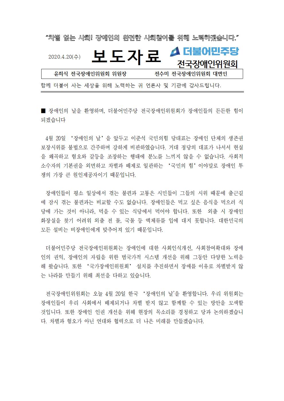 [논평] 더불어민주당 전국장애인위원회, 장애인의 날을 환영하며, 더불어민주당 전국장애인위원회가 장애인들의 든든한 힘이 되겠습니다