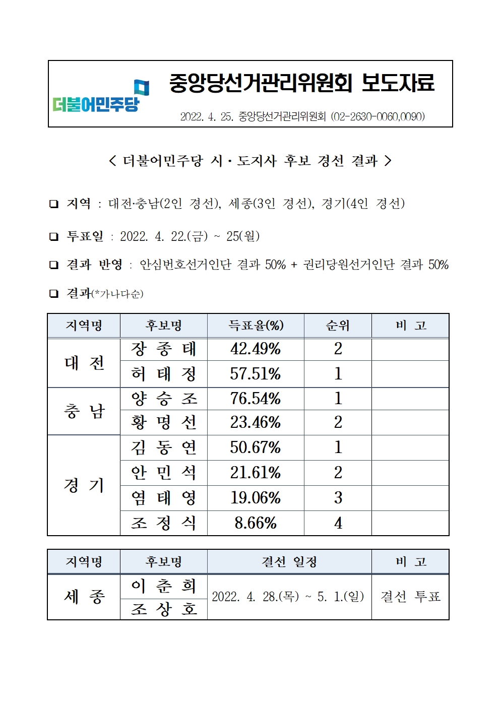[보도자료]중앙당선거관리위원회 - 더불어민주당 시도지사 후보 경선 결과