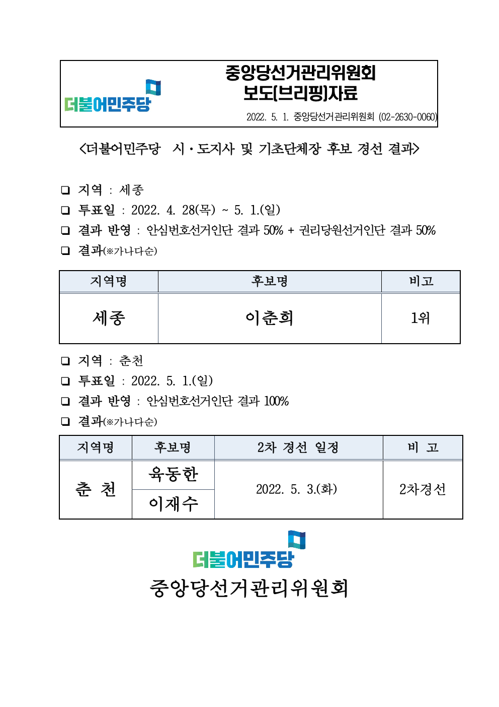 [보도자료]더불어민주당 세종·춘천 시도지사 후보 경선 결과